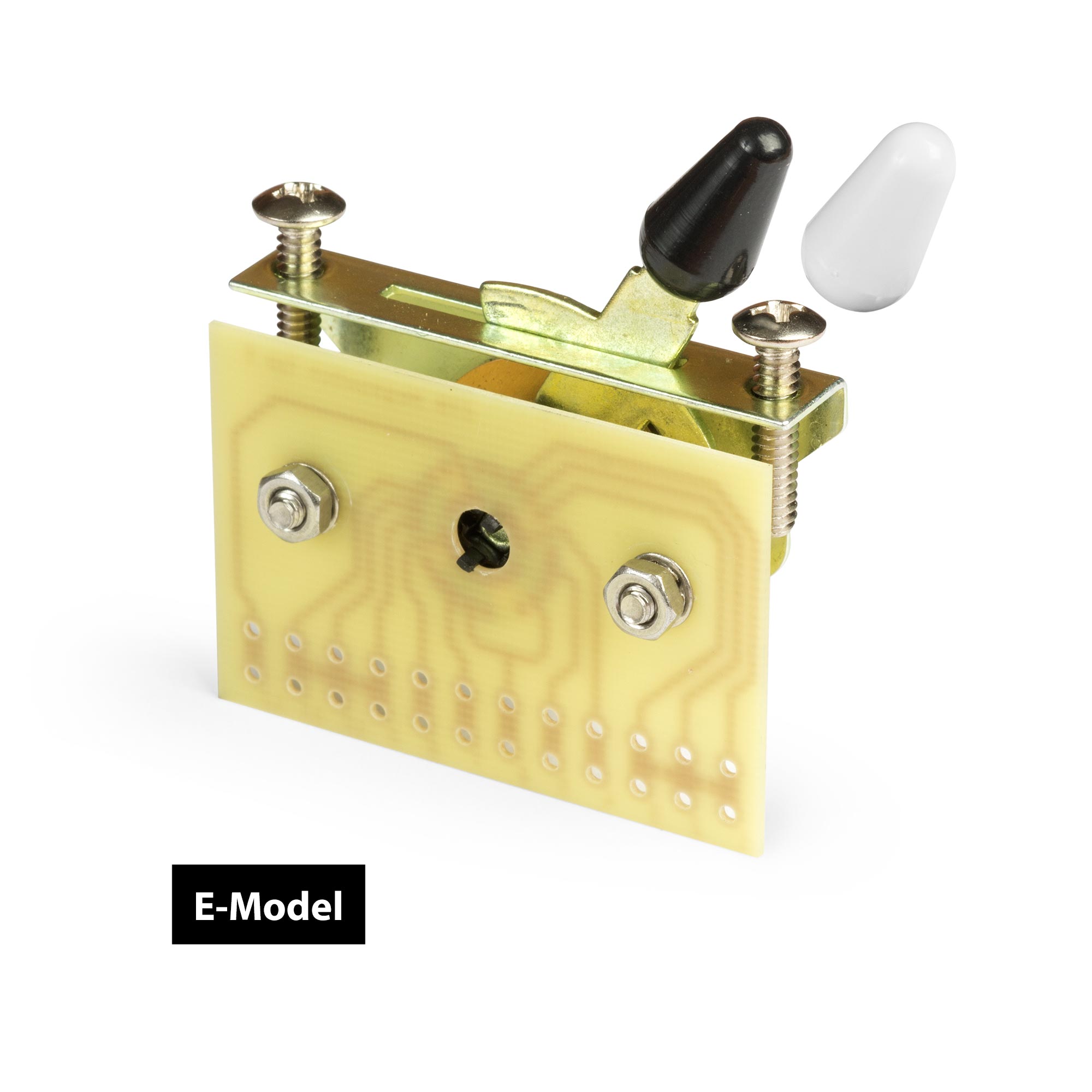 Der E-Modell-Megaswitch ermöglicht Verdrahtungskonfigurationen, die mit einem Standard-5-Wegeschalter nicht möglich sind, einschließlich coil-tapping und spezieller Hum-Cancelling-Anschlüsse. 12 Kabelschuhe bieten doppelt so viele Verdrahtungsoptionen wie frühere 6-Kabelschuhe-Versionen. Verwenden Sie diese zusätzlichen Laschen für alternative Tonsteuerungs- oder Aufnahmekombinationen. Umfangreiche und leicht verständliche Schaltpläne sind im Lieferumfang enthalten.