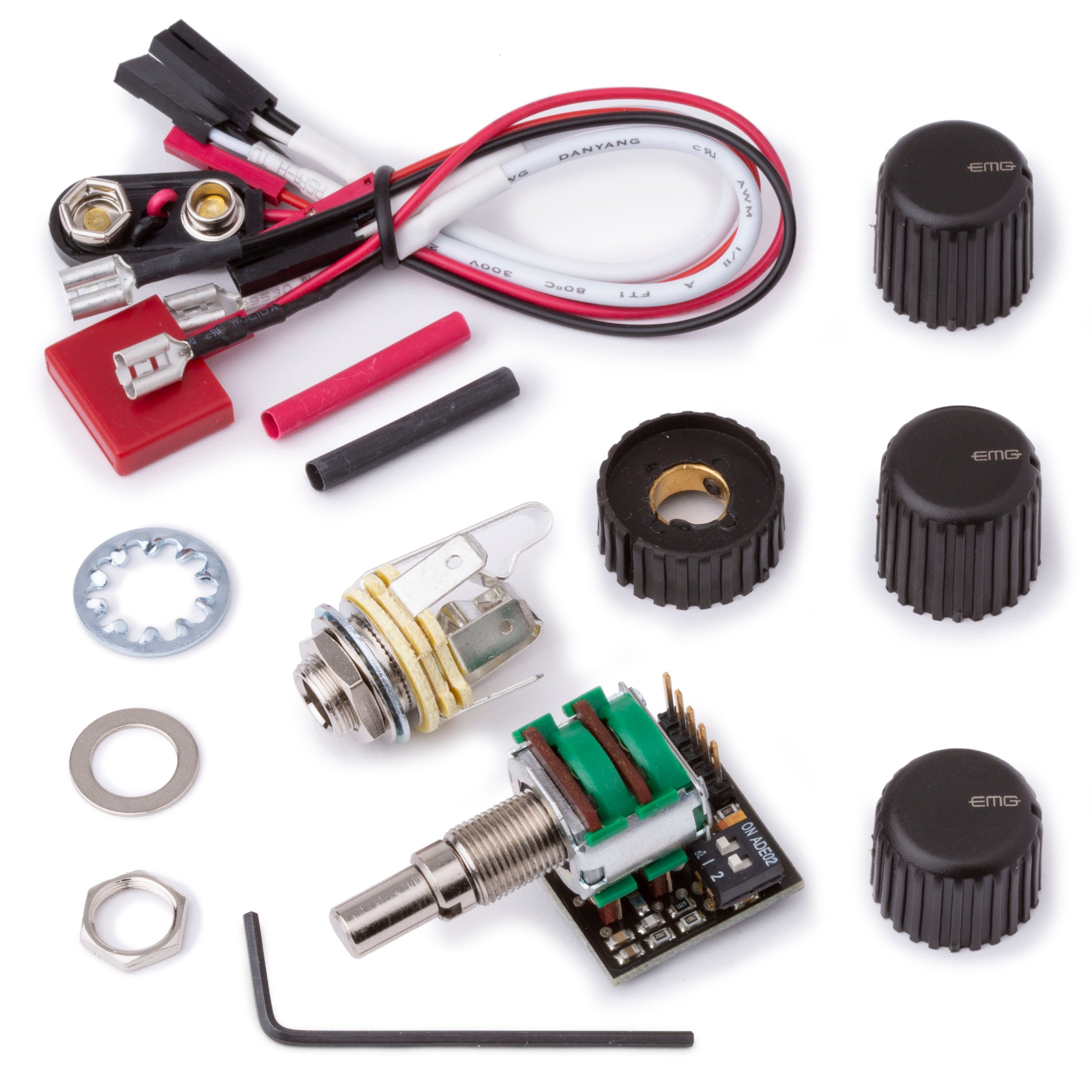 Das ABC Control ist für EMG Active Pickups ausgelegt. Es ermöglicht ein verlustfreies Gleichgewicht zwischen zwei Abholungen und verfügt über eine Mittelsperre für die mittlere Position. Wenn Sie passive EMG-HZ-Abholungen oder andere passive Abholungen verwenden, sollten Sie die B125 Active Balance Control verwenden, die gepufferte Eingänge für eine höhere Eingangsimpedanz aufweist. - BTC Control (B100) 2-Band-Equalizer für Bassgitarre. Der BTC verfügt über einpolige Filter zur Breitbandentzerrung. Oftmals werden die breiteren einpoligen Filter für Musikinstrumente bevorzugt, da sie weniger selektiv, am Ohr einfacher und „musikalischer“ klingen. Eine der Funktionen der BTC-Steuerung ist ein Dip-Switch mit 2 Positionen, der die Neigung des Hochfrequenzgangs steuert. Durch die Auswahl einer der vier Kombinationen kann der Hochfrequenzgang auf Ihre Wünsche zugeschnitten werden. Die BTC-Steuerung hat eine hohe Eingangsimpedanz und kann mit aktiven oder passiven Pickups verwendet werden. Die Bässe und Höhenregler sind auf einer konzentrischen Welle montiert und die Knöpfe sind im Lieferumfang enthalten.