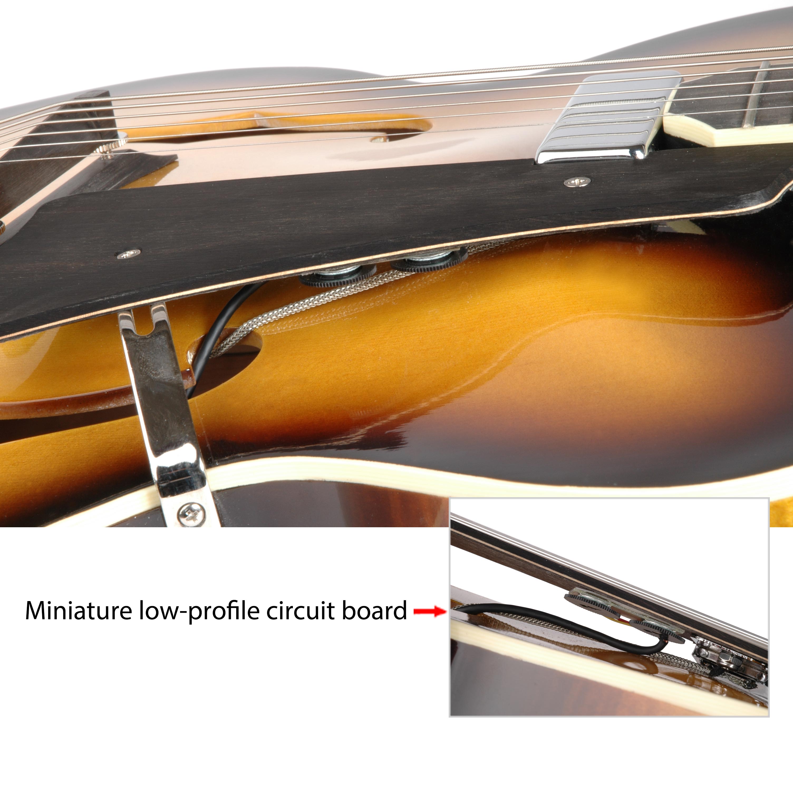 Eine Fingerspitzenlösung für Archtop-Akustikgitarren. Kompakte, leichte Ton-/Lautstärkeregler, die sich leicht unter dem Rand eines erhöhten Pickguards installieren lassen.