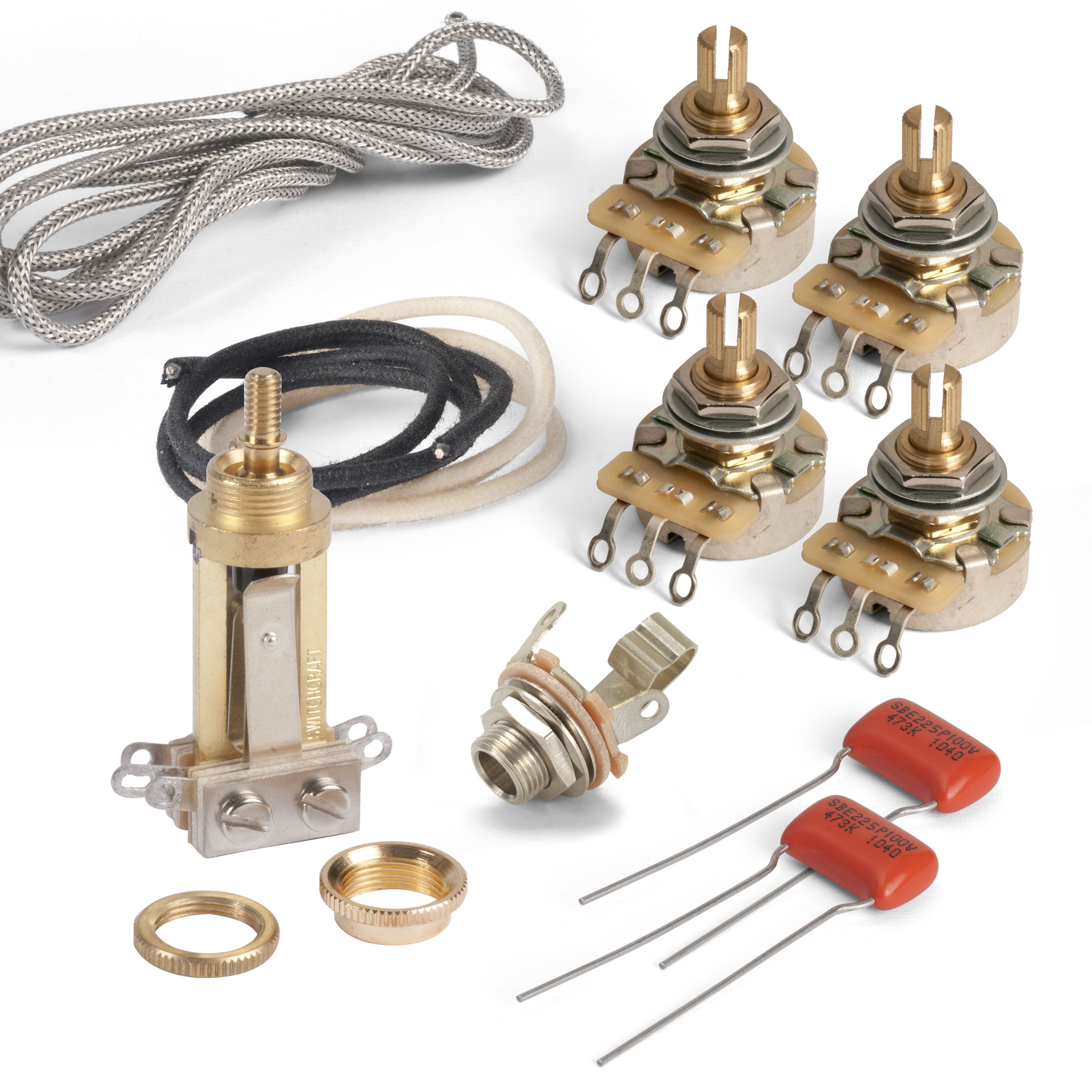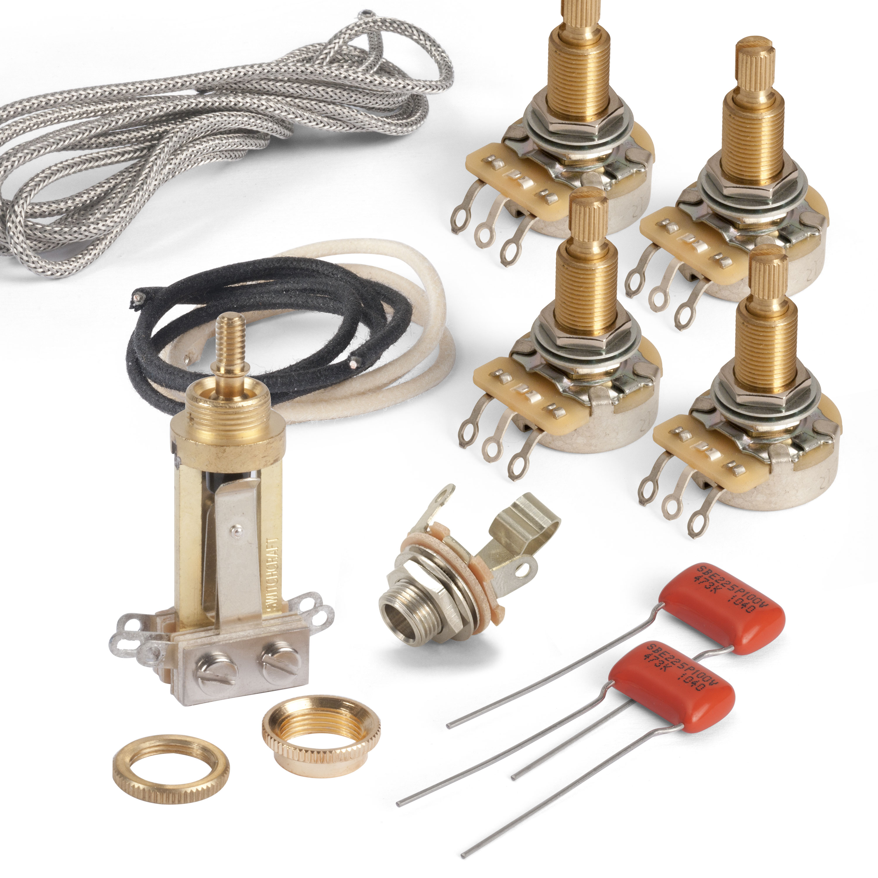 Mit diesen Kits können Sie ganz einfach Premium-Komponenten für die Verkabelung Ihrer Gibson® Les Paul®-Gitarre oder Bass oder einer anderen 4-Steuerungs-/2-Pickup-Gitarre mit einem 3-Wege-Schalter bestellen.