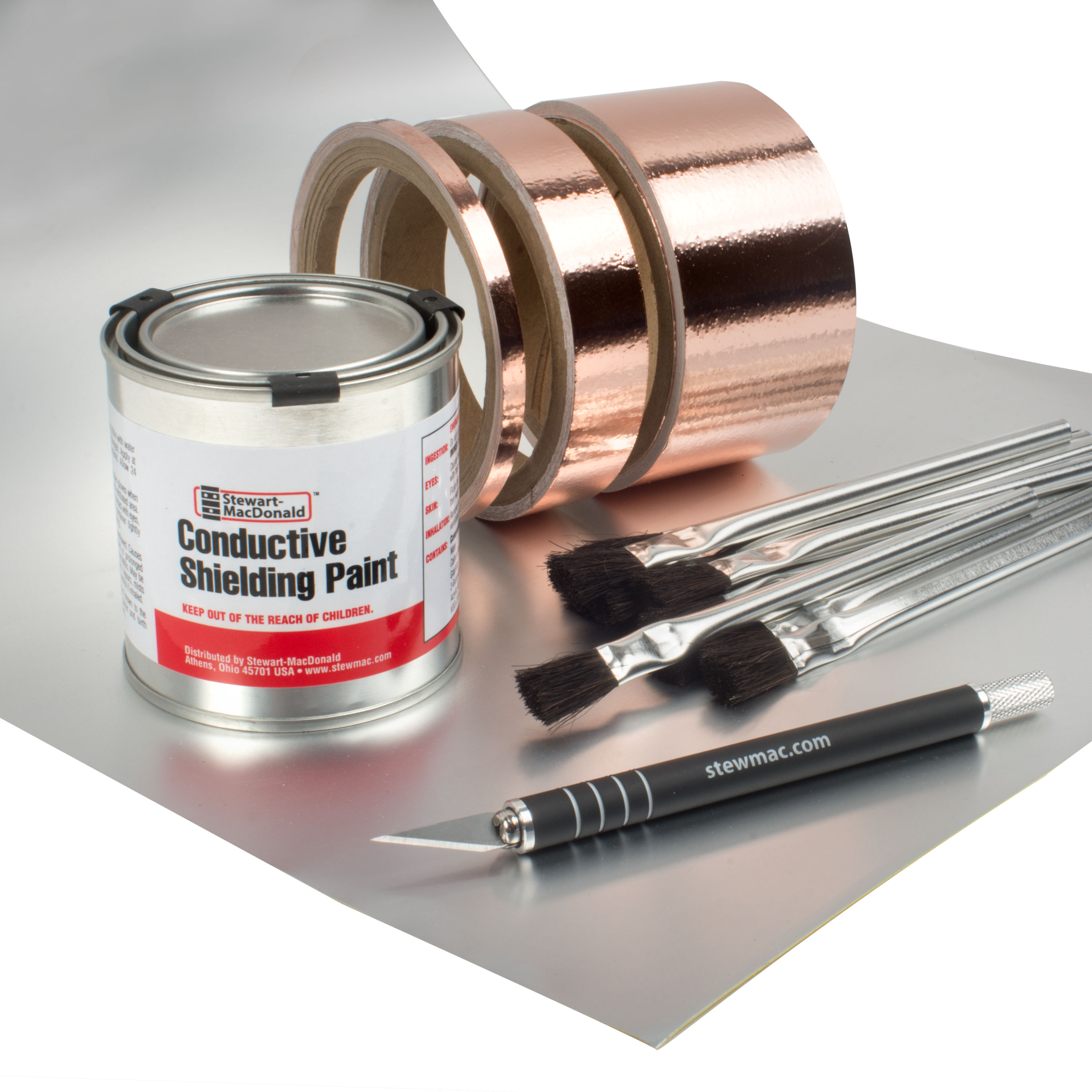 In diesem Set erhalten Sie leitfähige Abschirmfarbe und einen Satz Klebebürsten , um die Aufnahme- und Kontrollhohlräume schnell abzuschirmen, drei Größen leitfähiges Kupferband , um alle Aufnahmen und alle Größen von Hohlräumen abzuschirmen (dieses Band akzeptiert Lötmittel), Schlagbrett-Abschirmfolie für die Rückseite von Pickguards (essenziell für Fender Gitarren) und unser Lieblingsmesser , um das Band und die Folie sauber zu schneiden und zu trimmen.
