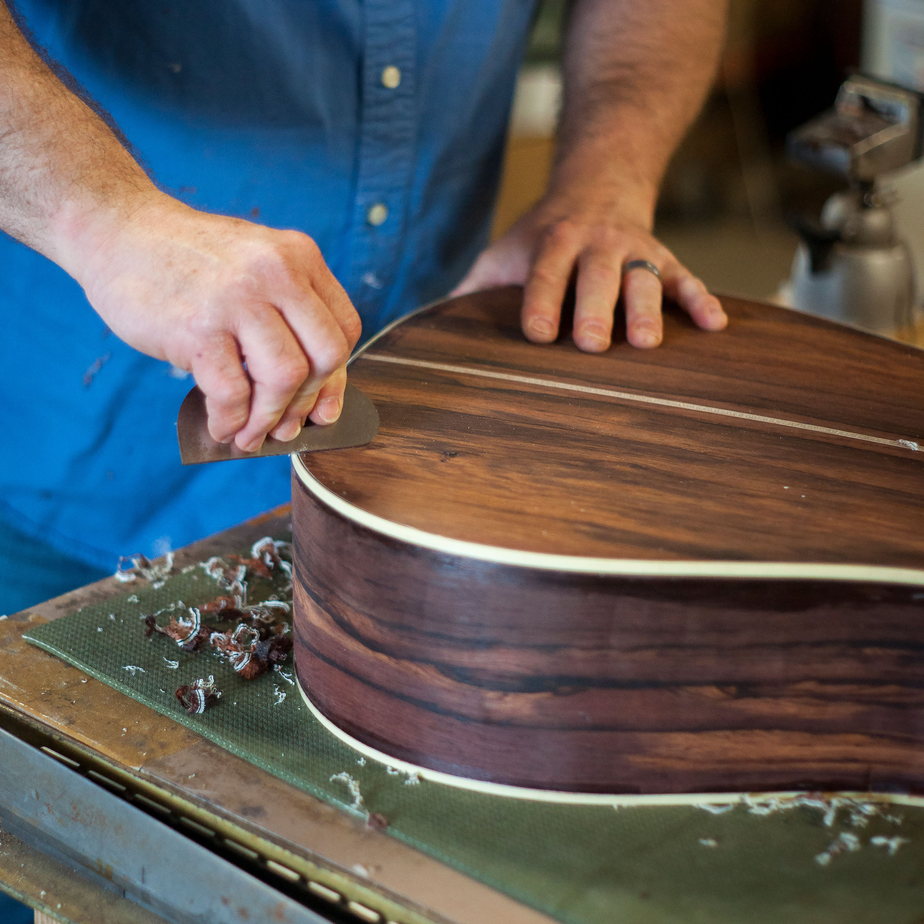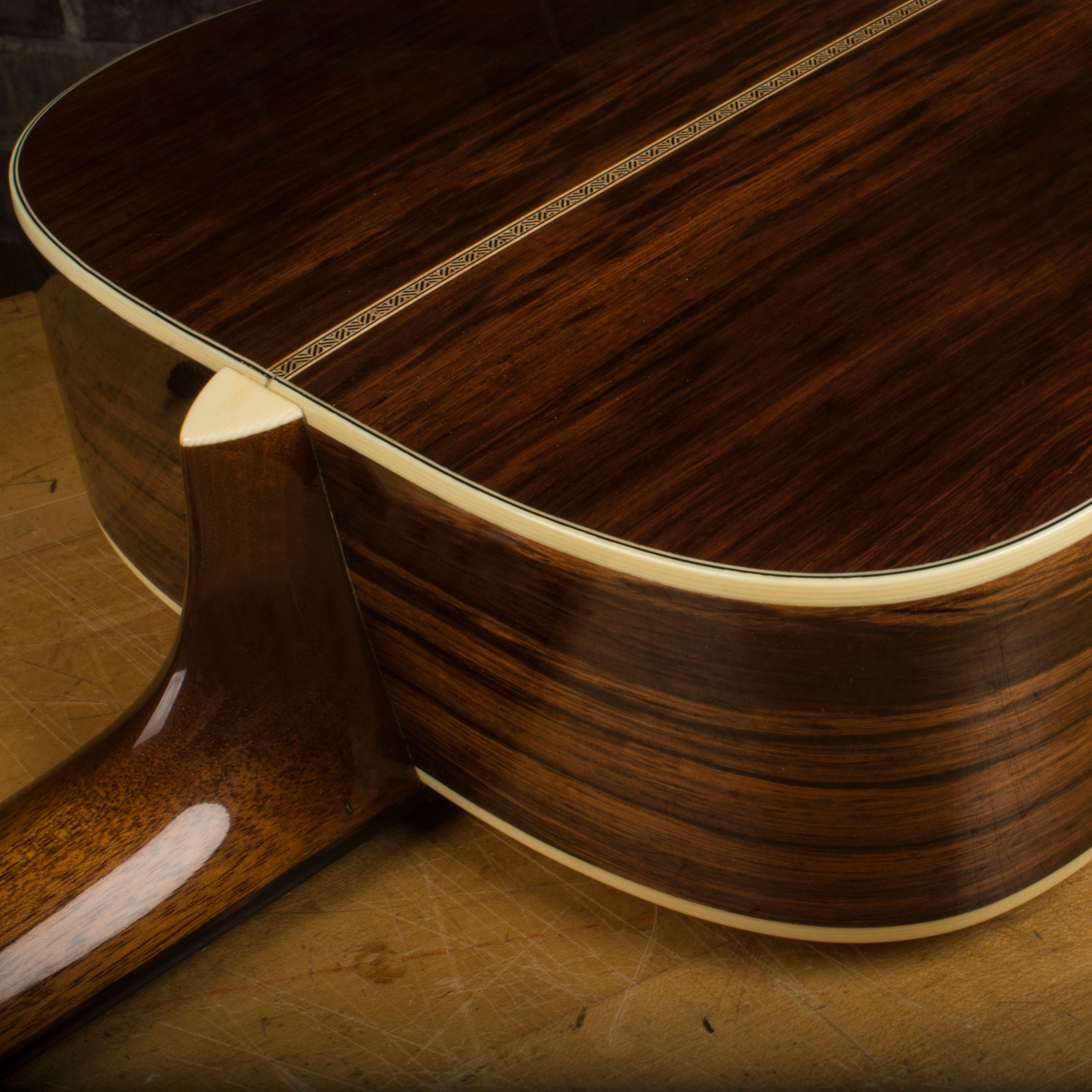 Wir haben dann den Palisander mit dem leichtesten und steifsten Adirondack Red Spruce (Picea rubens) aus unserem Reservat gepaart, genau wie in den 1930er Jahren in Nazareth. Um dem Vintage-richtigen Ton noch näher zu kommen, wurde das Top gequält. Diese spezielle Wärmebehandlung verändert das Holz auf molekularer Ebene – die Oberseite wird viel resonanter und reaktionsfähiger.