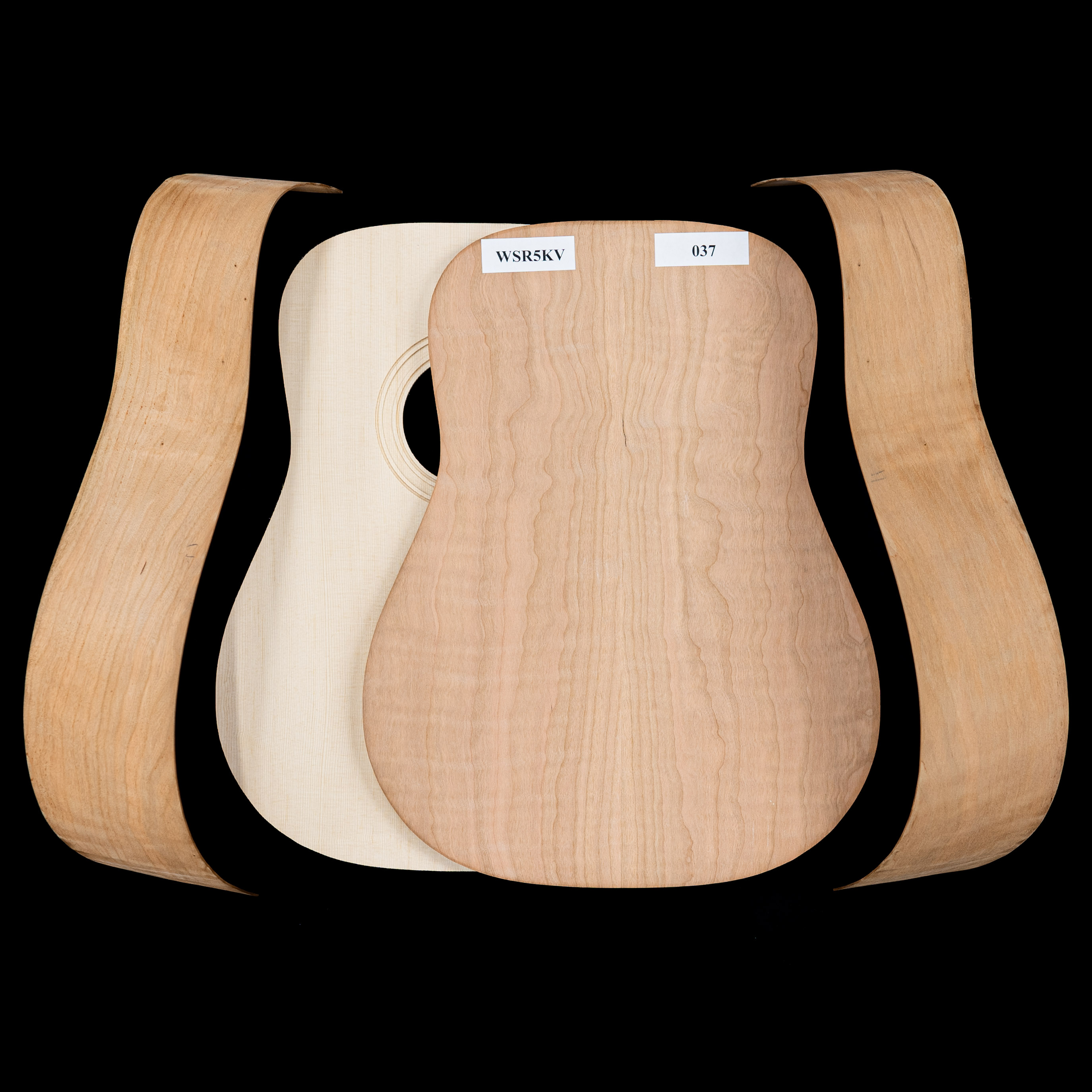 Inspiriert von modernen Boutique-Herstellern kombinierten wir ein kleines Stäbchen aus atemberaubend schöner, hochfiguriger Flammkirsche mit Lutz Spruce, um dieses unglaublich auffällige und brillante akustische Gitarrenset zu kreieren.