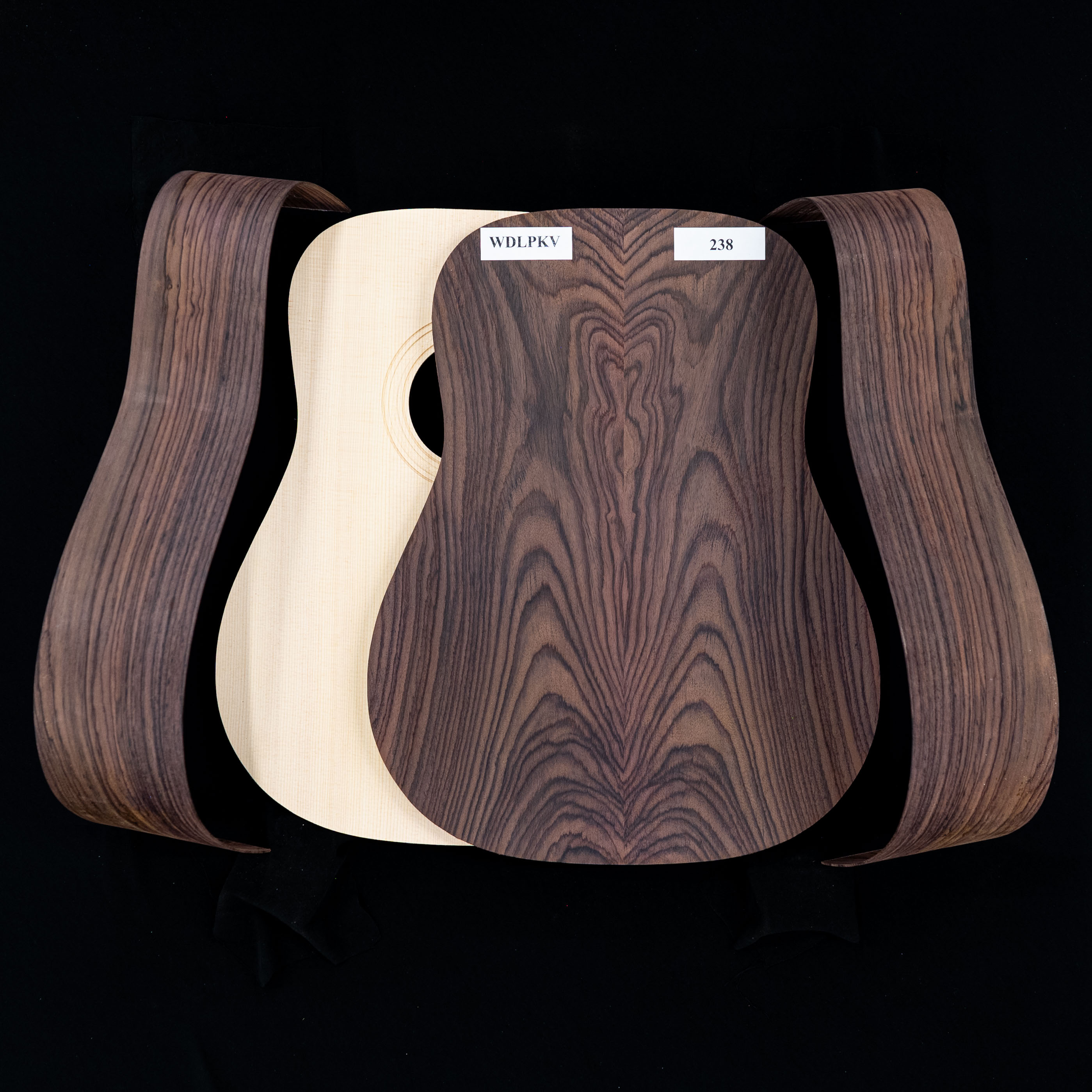 Während Wild Grain Rosewood manchmal eine Herausforderung sein kann, mit der man arbeiten kann, haben wir darauf geachtet, Teile auszuwählen, die stabil, flach und gut verhalten sind. Wir haben genau abgestimmt, die Rückseite zusammengefügt und sie in Form gebracht. Mit diesem optisch auffälligen und fantastischen, klingenden Holz können Sie jetzt Ihre Traumgitarre aufbauen.