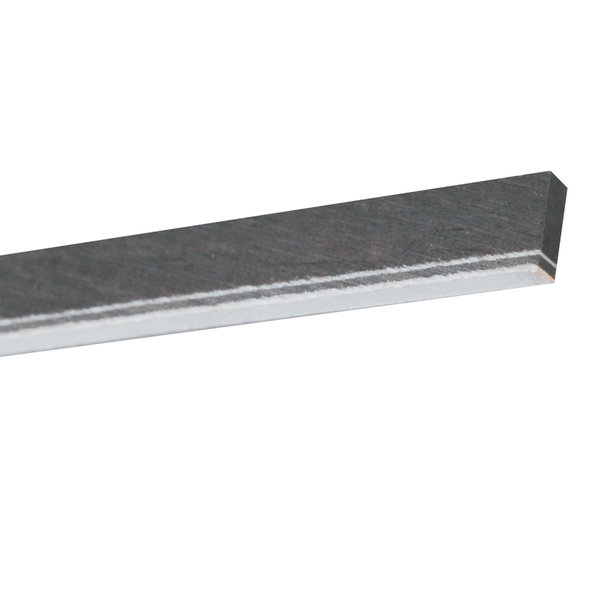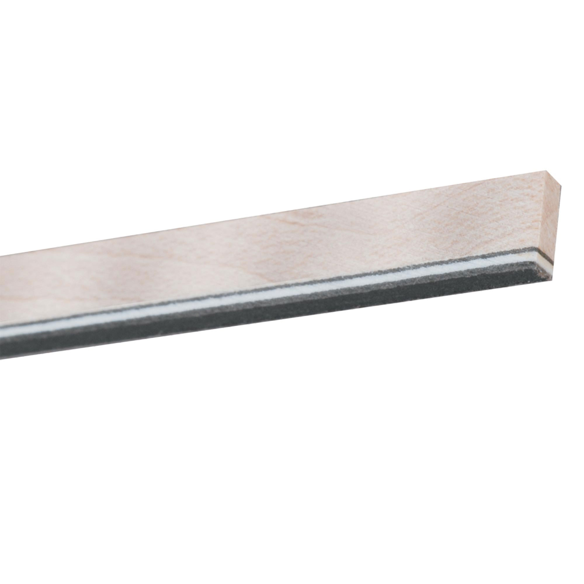 Jeder ungebogene Streifen ist etwa 0.0,08 Zoll dick, 0,250 Zoll hoch und 33-1/2 Zoll lang (2,03 mm x 6,35 mm x 850,90 mm). Die optionale Dreifachlaminierung ist .0,010"/.020"/.0,010" weiße und schwarze Faser.