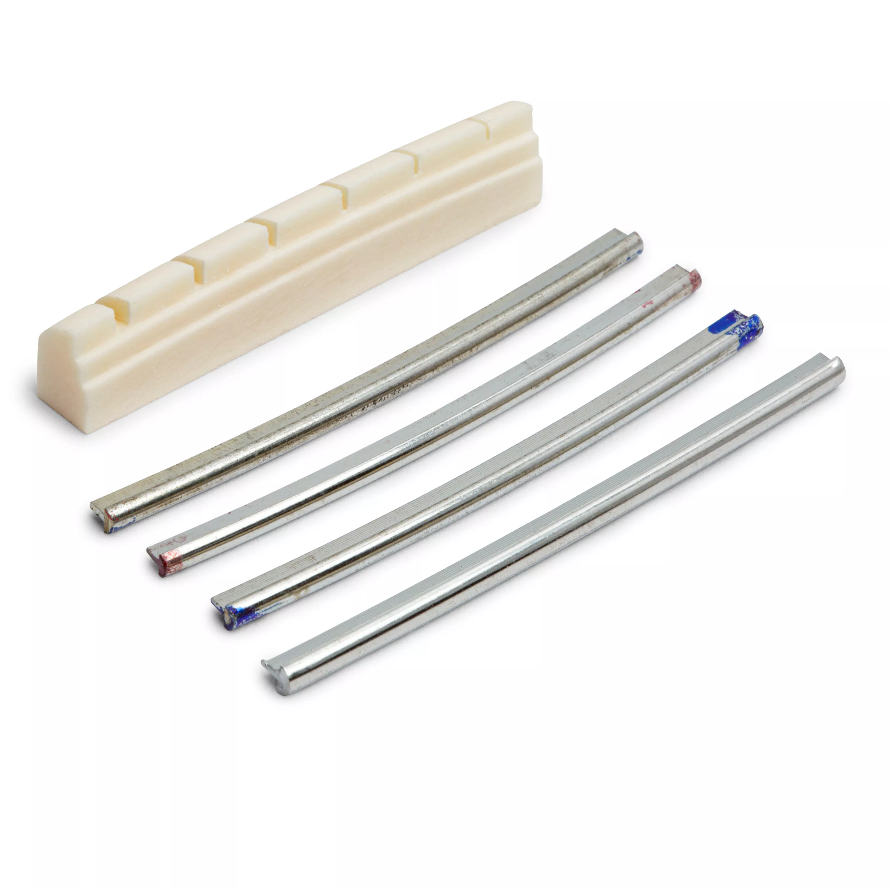 ZerO Glide bone nut is a direct replacement, with sizes to fit a wide range of guitars and banjos. You get four frets of different heights, to match the frets on your guitar. These are of a special nickel silver alloy that's harder and longer-wearing than conventional frets.