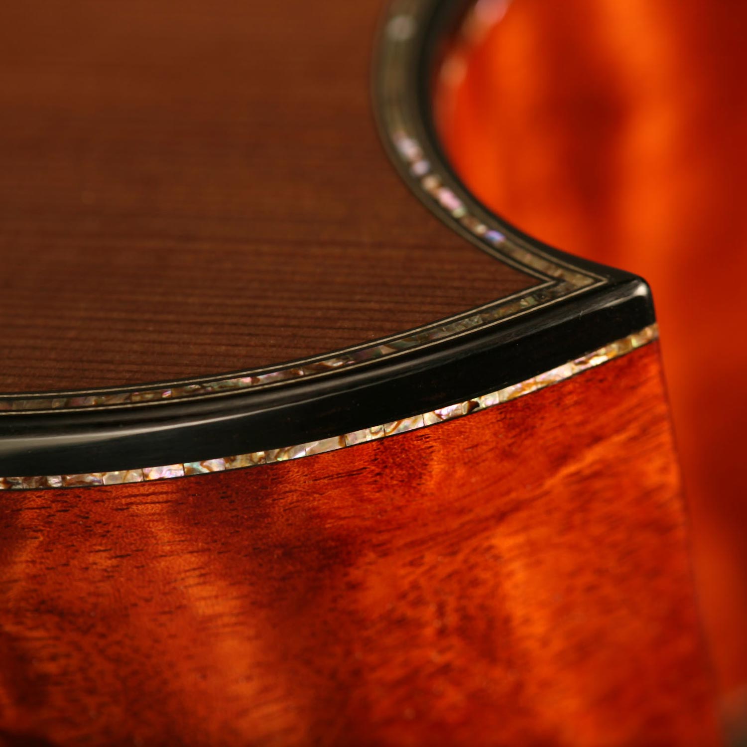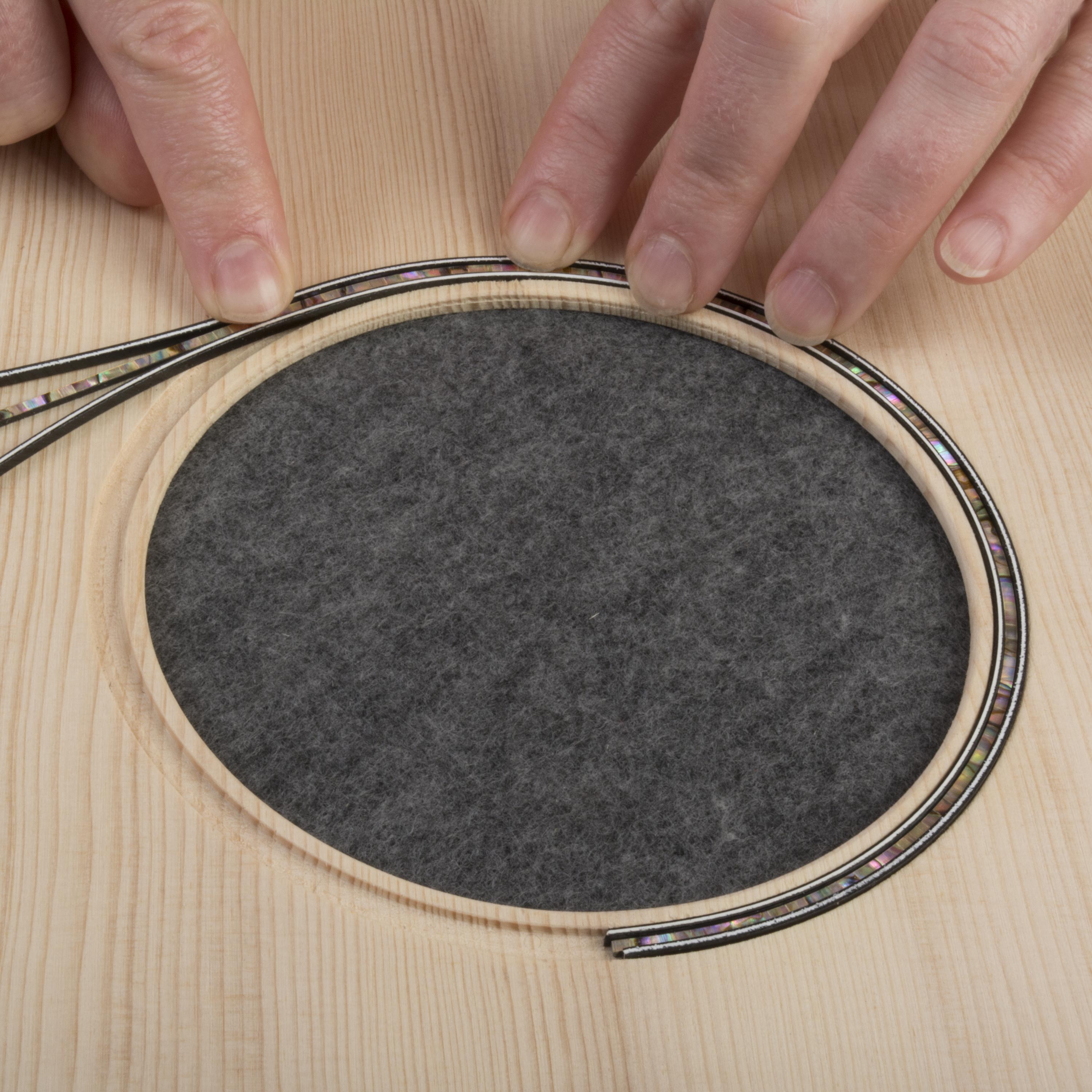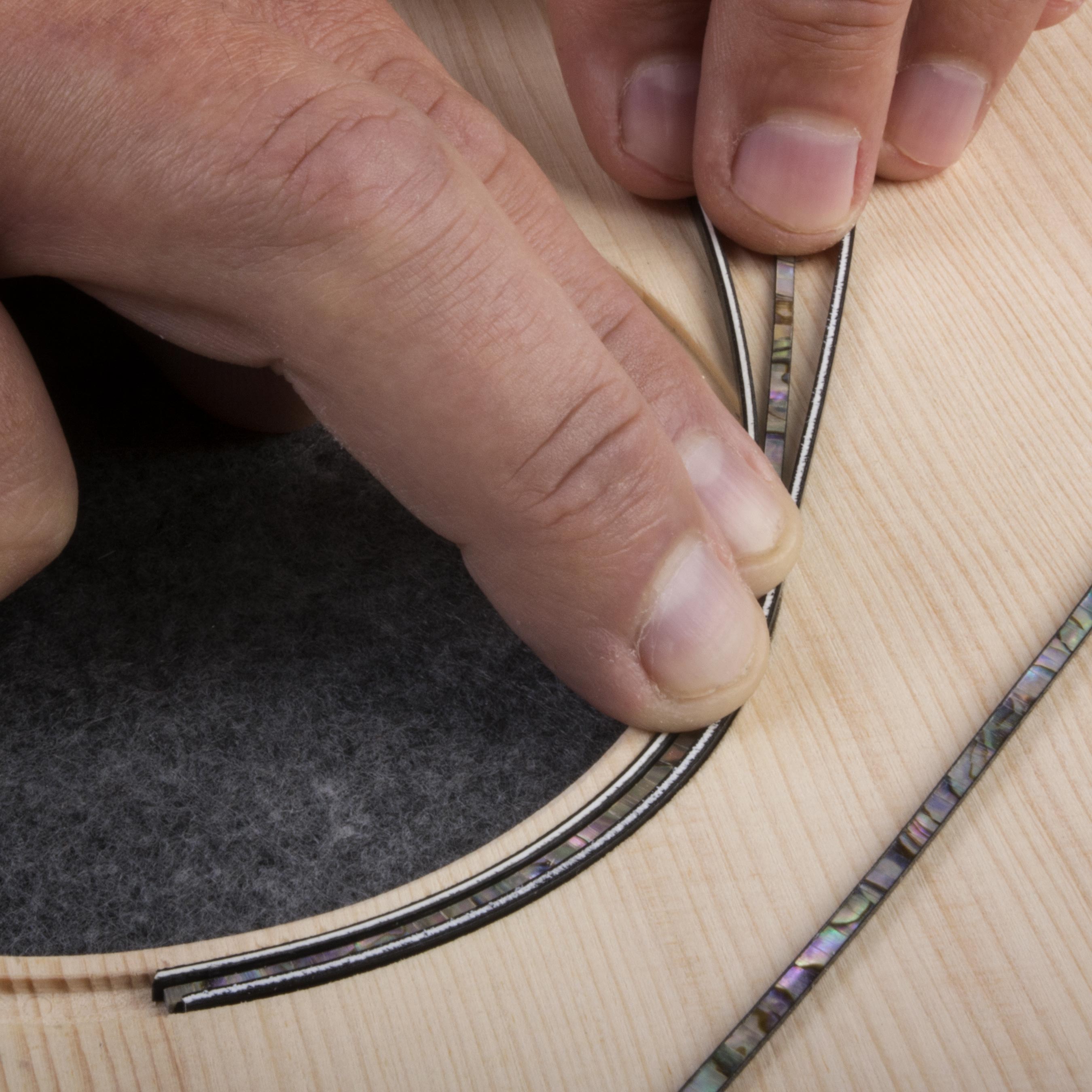 ZipFlex ist eine ausgewählte grüne Abalone-Hülle auf einer flexiblen Basis, die sich zu jeder Kurve biegen lässt. Legen Sie sie zwischen die äußeren Holzbindungen und kleben Sie sie einstückig ein. Reißverschluss! – Du hast das Schallloch eingepflegt!