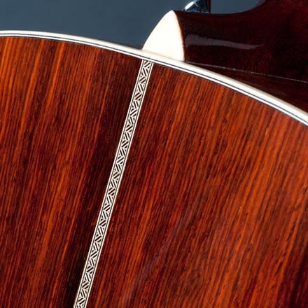 Das markante „Zipper“-Muster aus Holzmarquetrystreifen, das an der hinteren Mittelnaht der Martin-Gitarren der Stile 28 und 21 vor dem Zweiten Weltkrieg verwendet wird.
