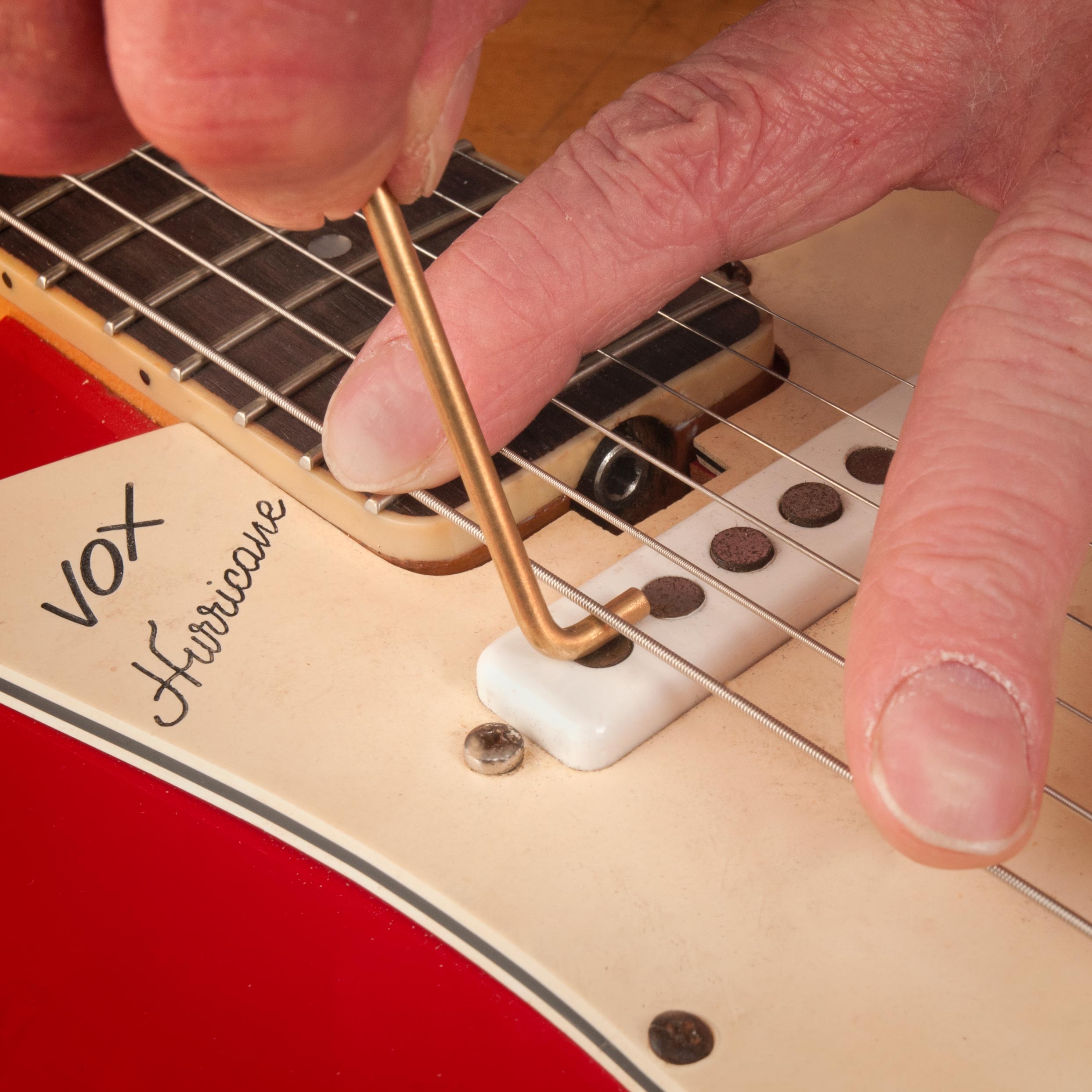 In diesem Set erhältst du ein String Action Gauge , um die Höhe des Fadens und des Brückensattels einzustellen (und vieles mehr), ein Set von Unterstring Radius Gauges , um die Brückensättel auf den Radius deines Bretts einzustellen, und ein Set von Pickup Clearance Gauges, der einfachste Weg, um deine Lieblingsaufnahmehöhe zu finden und einzustellen.