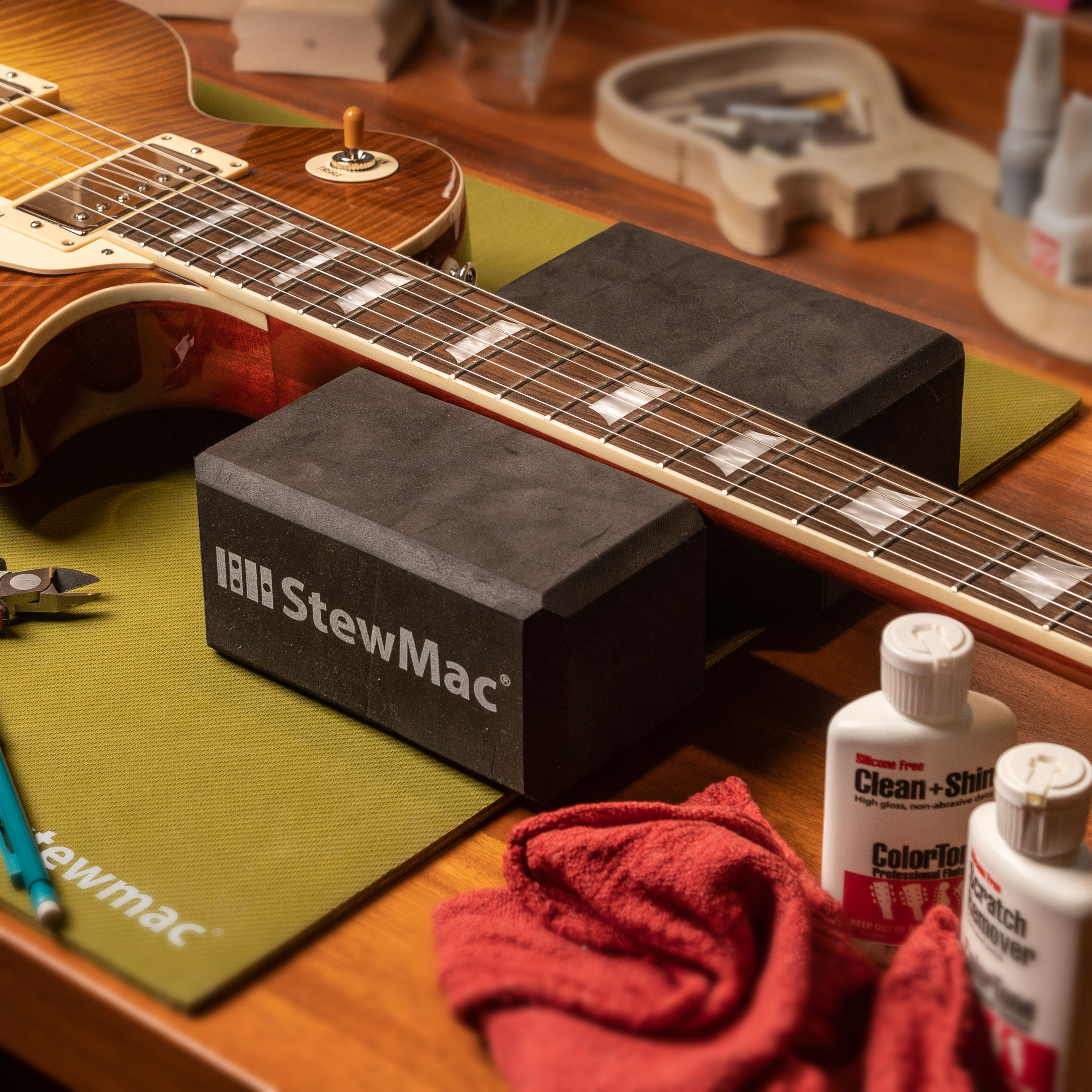 - Reinigen Sie Ihre Gitarre komplett mit ColorTone Scratch Remover, ColorTone Clean + Shine Polish, zwei Poliertüchern und einem StewMac Polierfäustling.