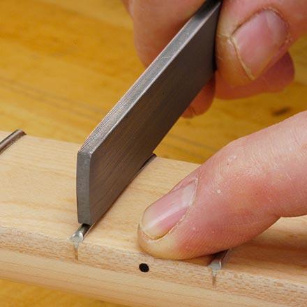 Neue Fältchen benötigen nach der Installation ein wenig Nivellierung und Formgebung. Mit dem Radiusblock nivellierst du die Fältchen gleichmäßig und bleibst gleichzeitig im Radius. Die Fret-File mit doppelter Kante hat zwei Seiten, damit Sie Ihre nivellierten Frottee schnell und einfach nachziehen können. Sie sind viel einfacher zu verwenden als eine herkömmliche Drei-Eck-Datei, und Sie werden schnell beherrschen, wie Sie Ihre Ärgernisse richtig machen.
