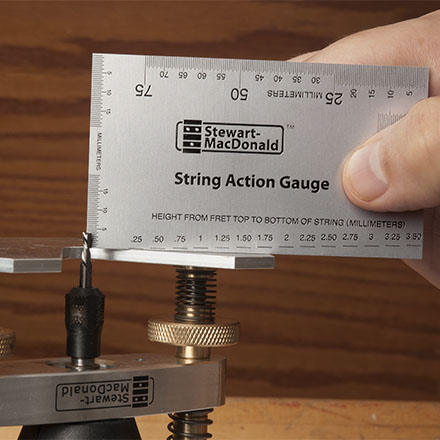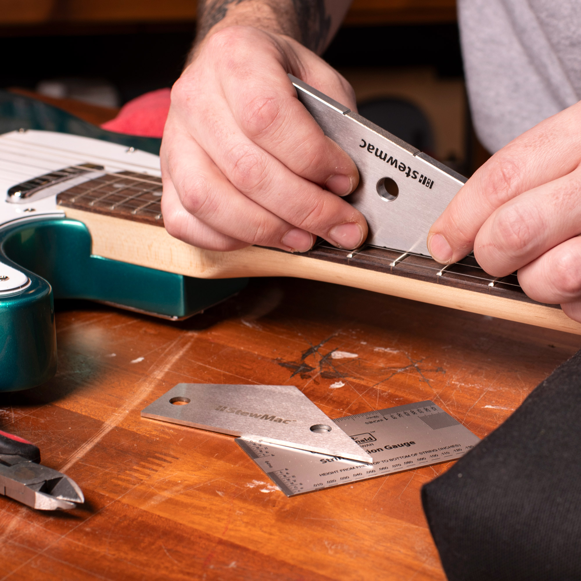 Zum Trio gehört auch unsere Lehre zum Messen der Saitenlage, ein unverzichtbares Werkzeug zum Einstellen der Höhe von Saiten, Sätteln, Stegeinlagen und Tonabnehmer-Polstiften. Das Werkzeug wurde speziell für Saiteninstrumente entwickelt und ist schneller und präziser als ein normales Lineal. So kannst du die perfekte Einstellung für deine Gitarre oder deinen Bass finden.