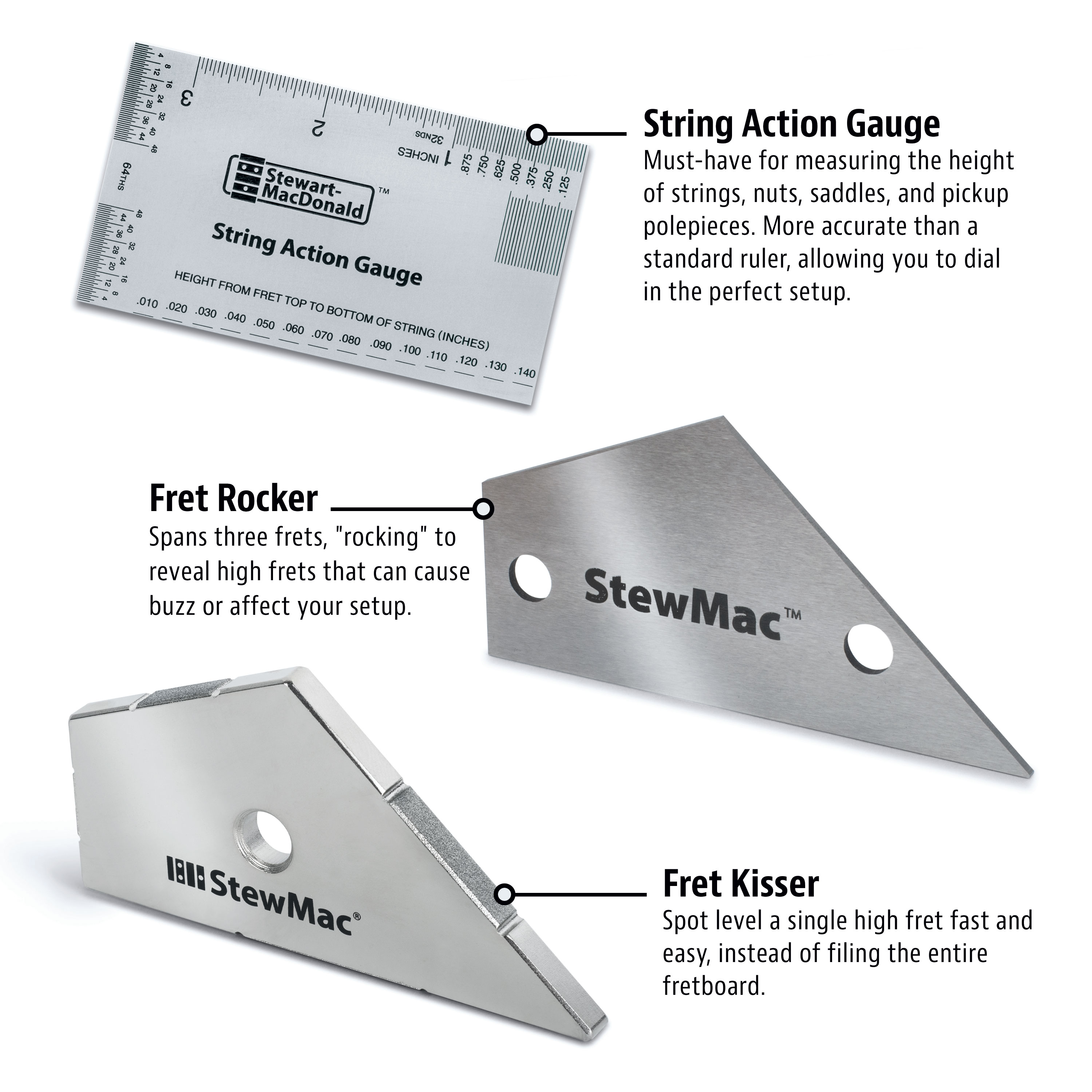 Das Bundierwerkzeug-Präzisionstrio kombiniert drei unserer beliebtesten und unverzichtbaren Werkzeuge für das Einstellen und Reparieren von Gitarren. Egal, ob du ein erfahrener Profi bist oder gerade erst anfängst: Dieses Set enthält alles, was du brauchst, um häufige Probleme mit Bundstäbchen einfach und genau zu erkennen, zu messen und zu beheben.