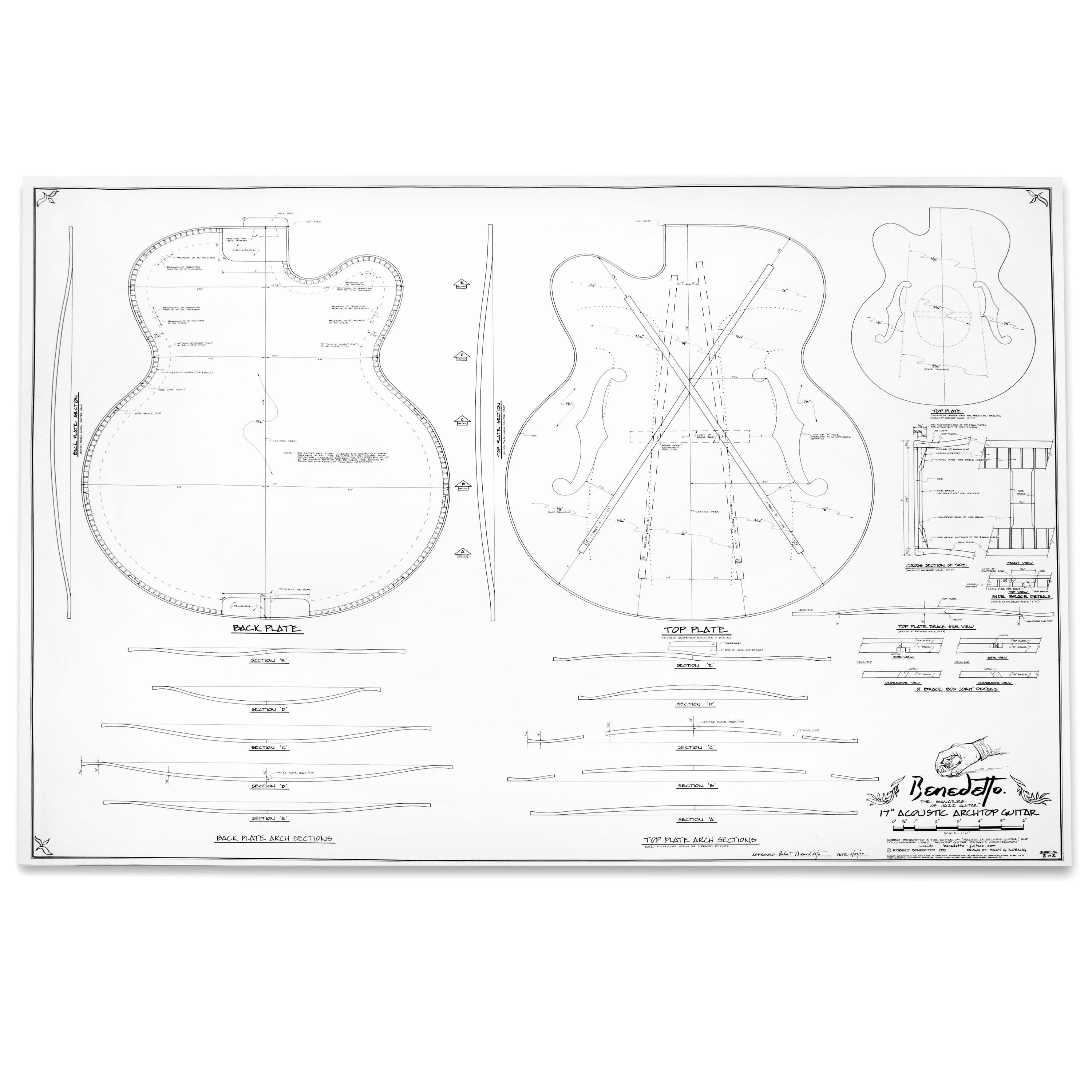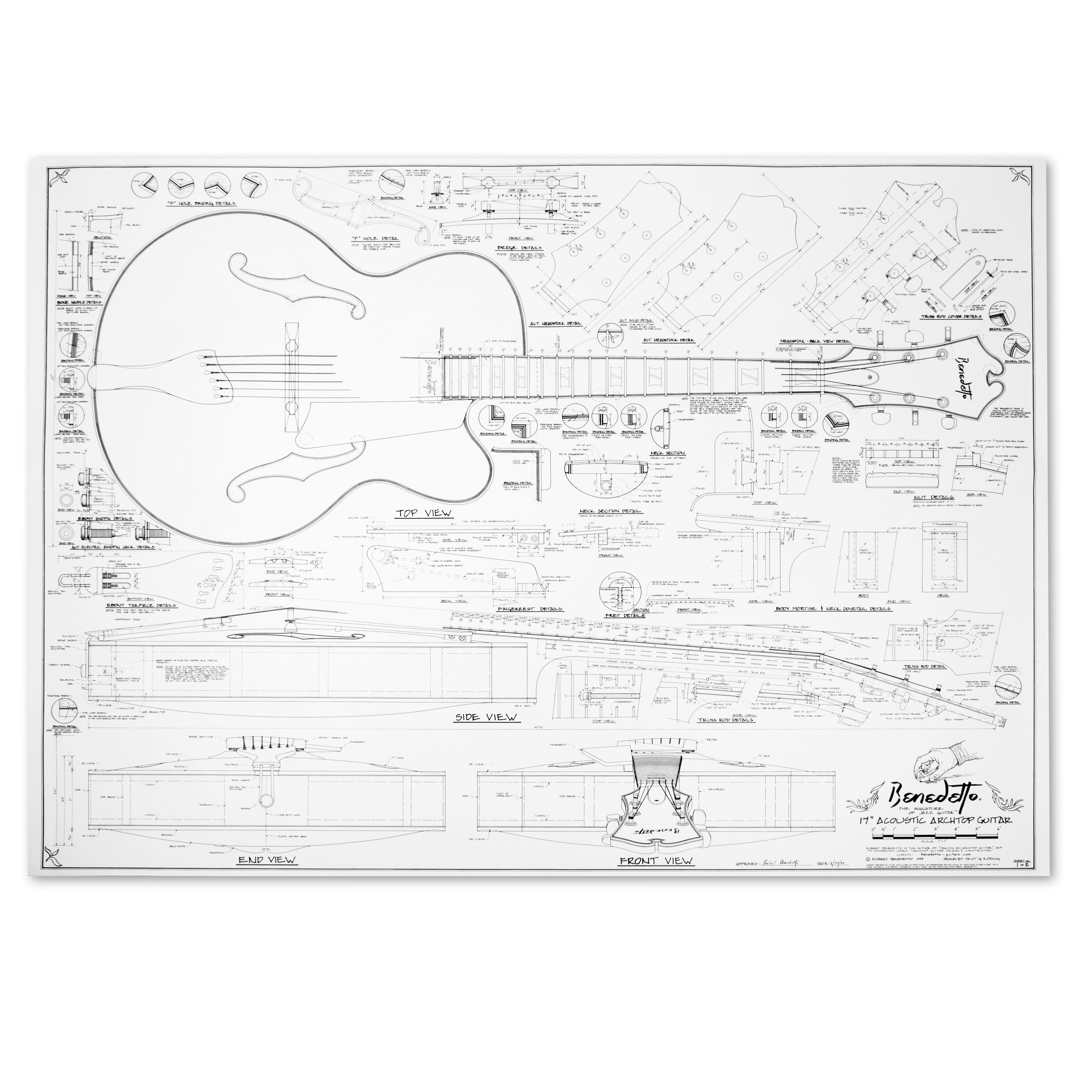 Diese umfassenden Pläne des Herstellers sind Kunstwerke an sich, die die Qualität der Benedetto-Jazzgitarre (25"-Skala) widerspiegeln.