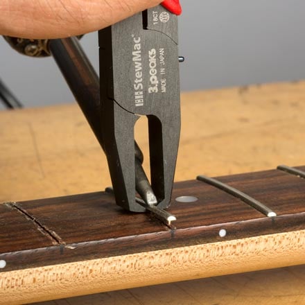 Verwende bei der Arbeit mit trockenen und schwierigen Griffbrettern die „Precision Pullers“-Ziehzange zusammen mit unseren Chip Stoppers zur Vermeidung von Splittern. So kannst du noch sicherer sein, dass alles glatt läuft und nichts absplittert.