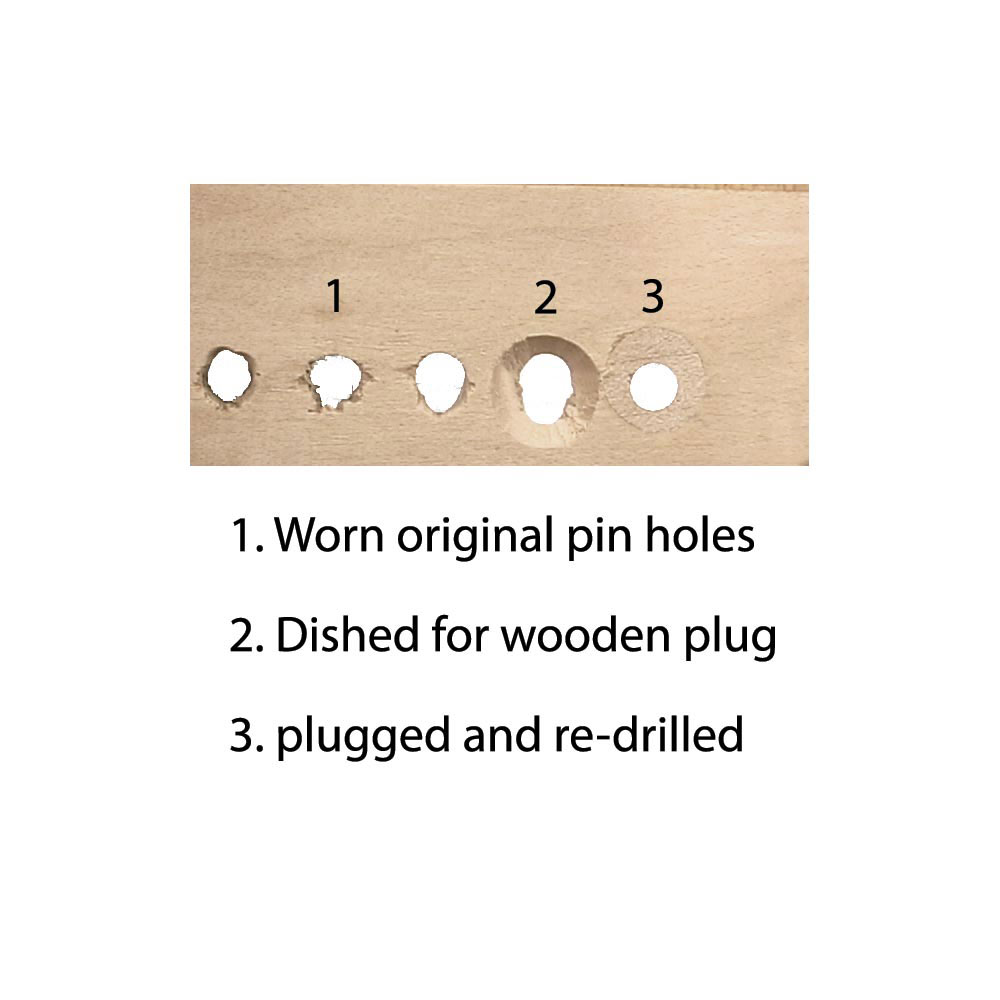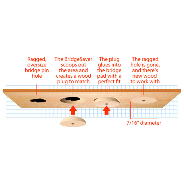 Der BridgeSaver besteht aus einem langlebigen, handbetätigten Stahlschneider, der einen präzise abgeformten Hohlraum an der Unterseite des Brückenstiftlochs schafft, und einem Stahlschneider für die Herstellung eines passenden Holzstopfens. Kleben Sie die Stopfen bündig und bohren Sie nach, und Sie haben saubere neue Verankerungsflächen für die Stränge und Brückenstifte.
