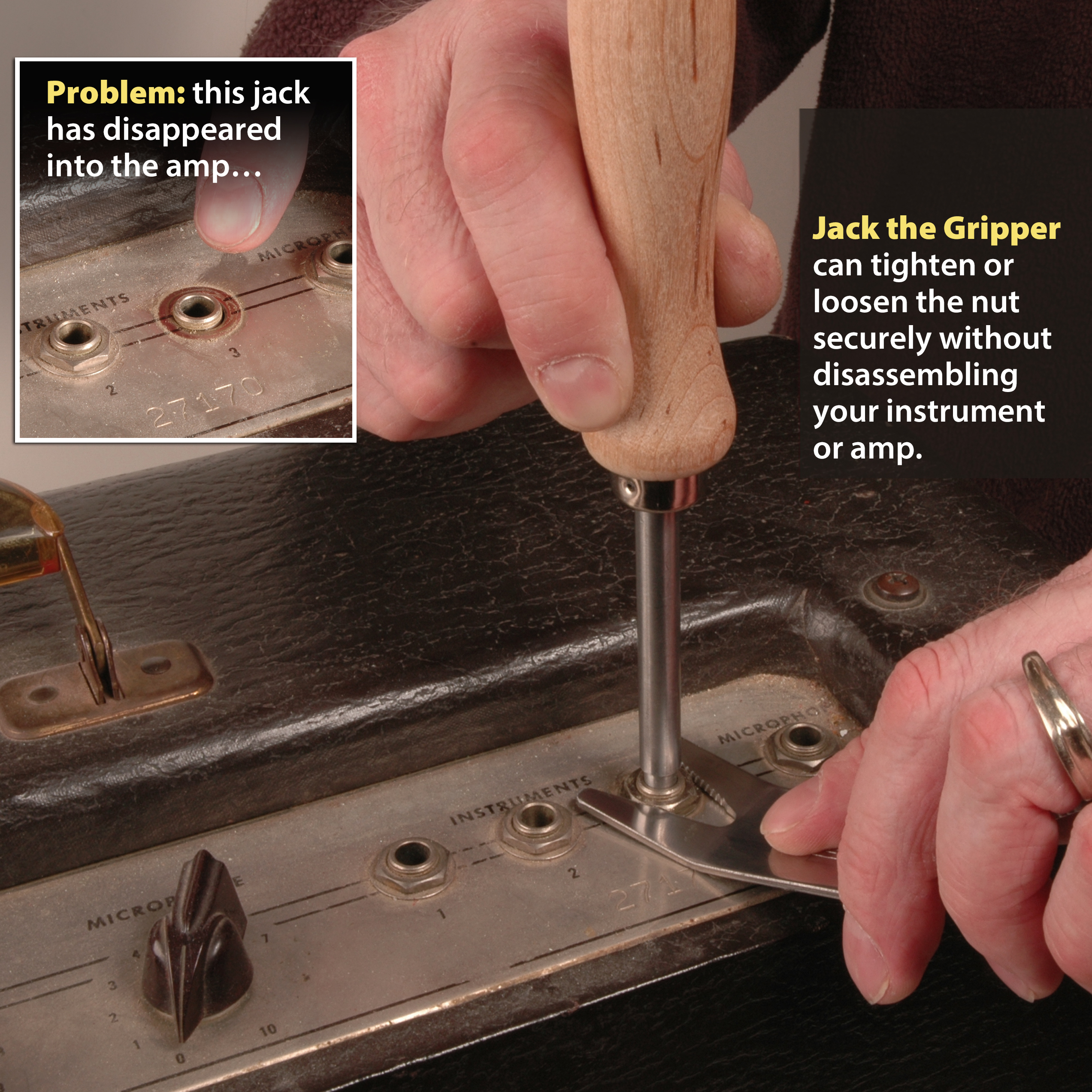 Eine lose Mutter an einer 1/4"-Buchse ist problematisch. Es macht keinen Spaß, zu sehen, wie der Wagenheber in Ihrer Gitarre oder Ihrem Ampere verschwindet, wenn die Mutter abfällt, oder eine Lötverbindung zu brechen, wenn Sie die Mutter anziehen und sich der Wagenheber damit dreht.