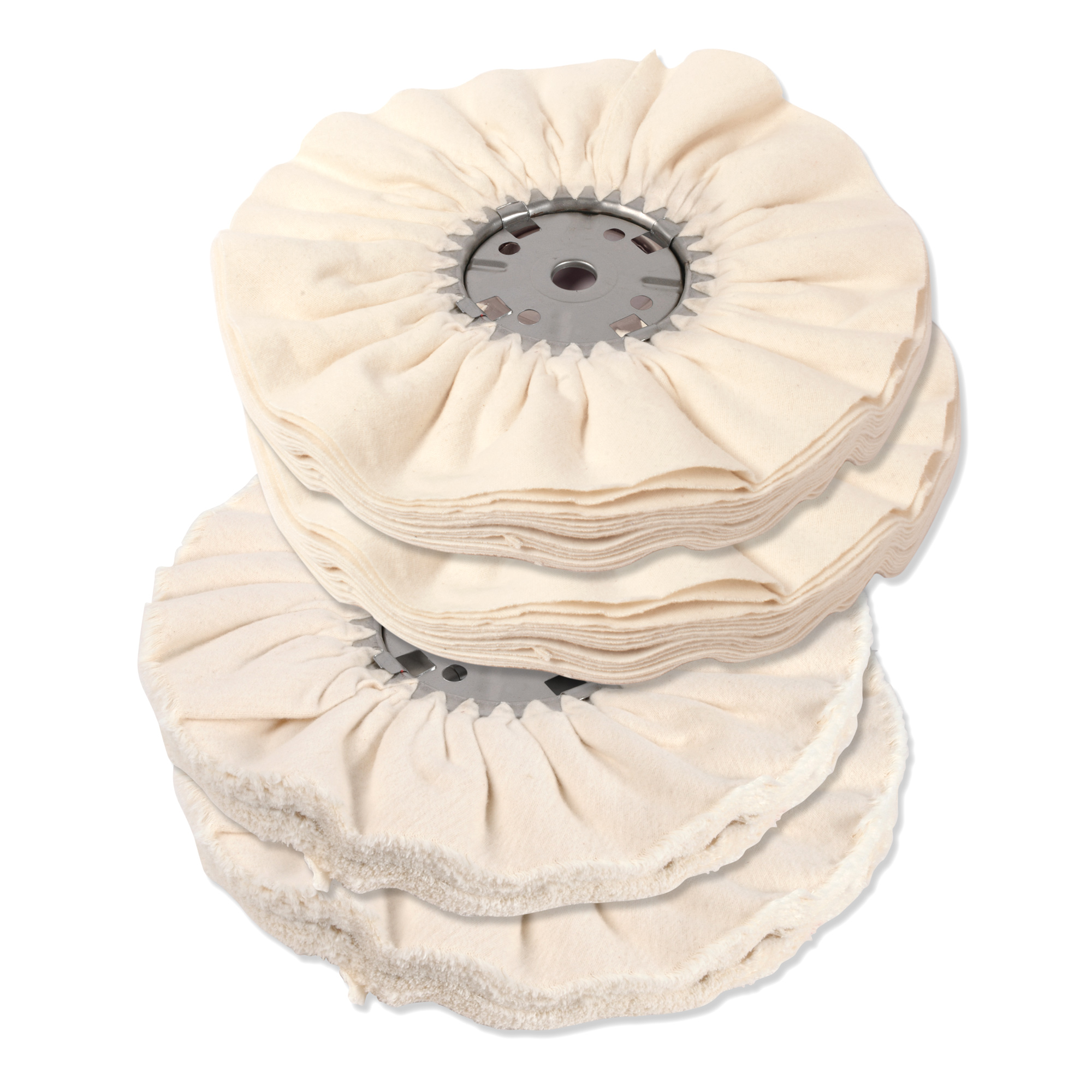 Die großen Polierscheiben mit 14" Durchmesser wurden gezielt für das Polieren von Instrumenten ausgewählt. Unser Guitar Buffer umfasst jeweils 2 kantonale Flanellräder für grobe und mittlere Verbindungen und 2 Domet Flanellräder für feine Verbindungen für einen extrahohen Glanz. Für eine möglichst große Polierfläche passen bis zu drei Scheiben auf jede Seite des Dorns (vier Scheiben sind im Set enthalten). Weitere Scheiben sind separat erhältlich.