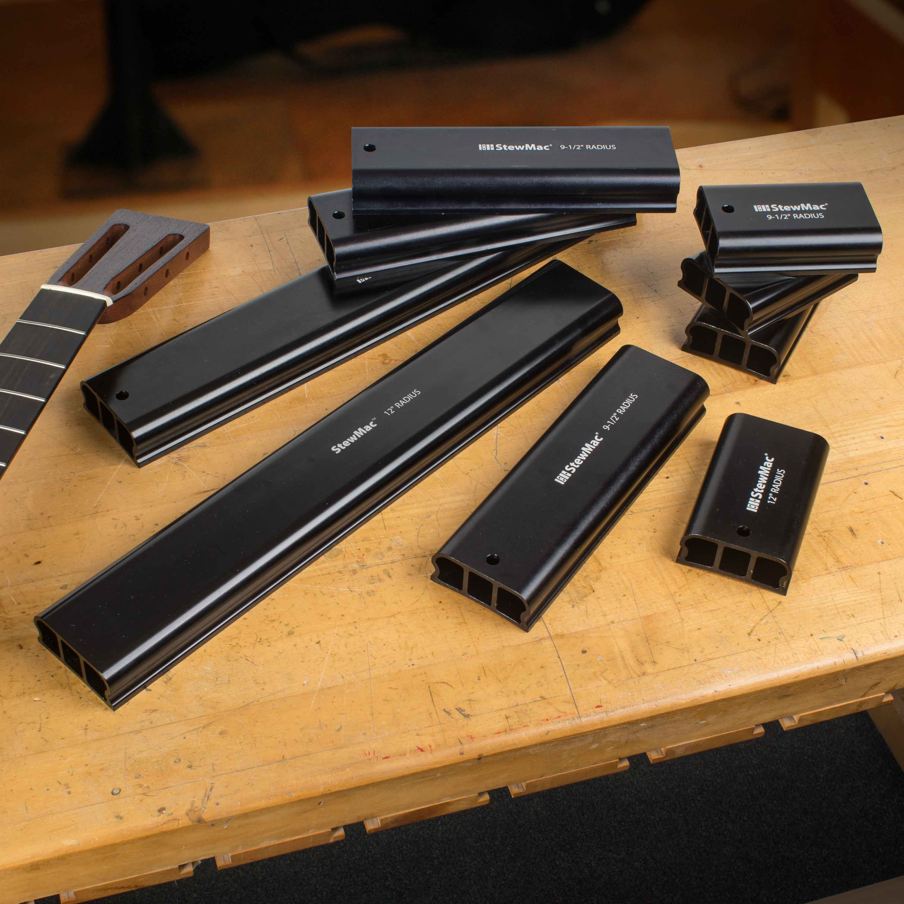 Schaffen Sie einen konstanten Radius auf einem ungesättigten Fingerboard oder nivellieren Sie installierte Fältchen mit diesem einzigartigen Tool für den professionellen Gitarrenladen.