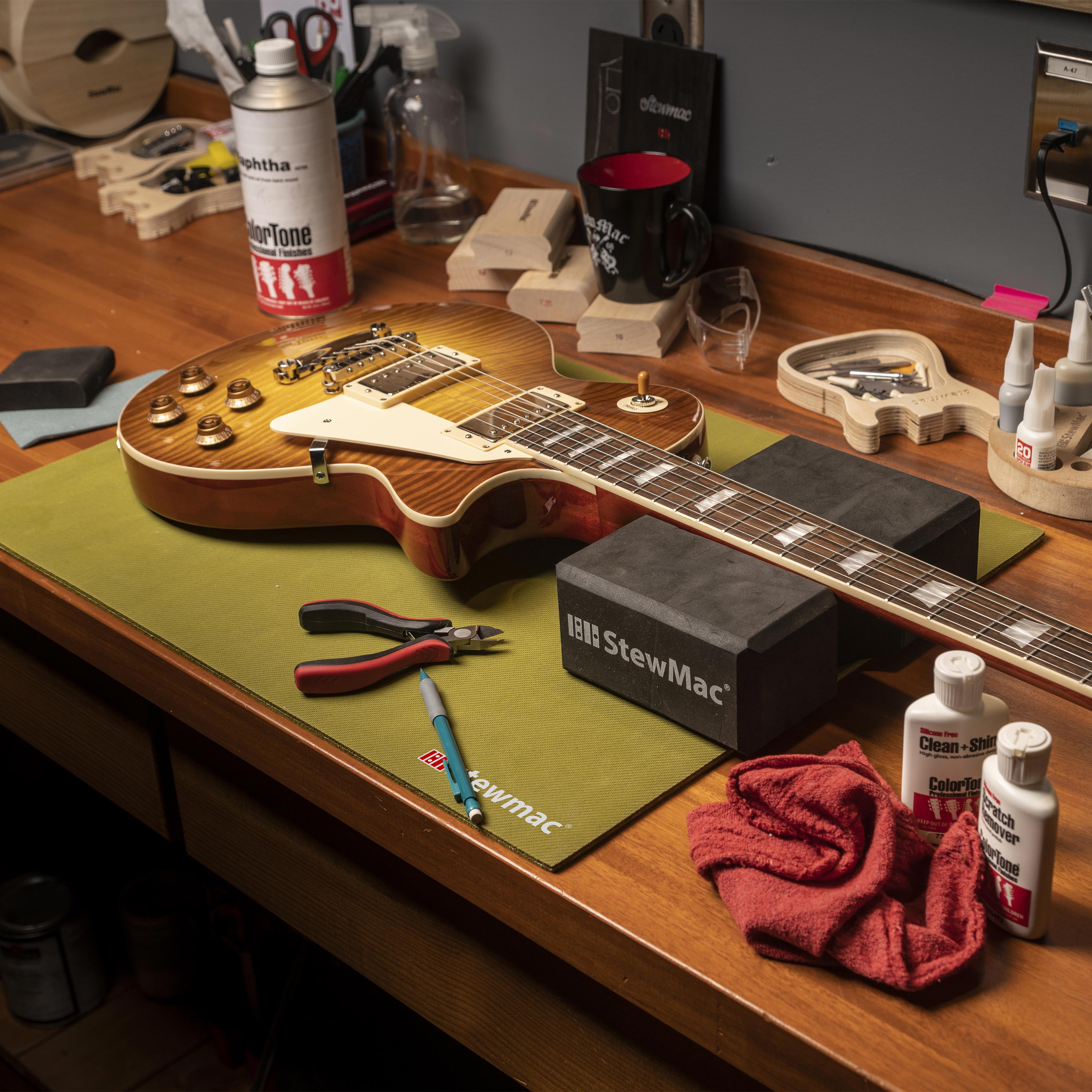 Das ist eine einfache Sache, aber eine Halsauflage ist eines der wichtigsten Werkzeuge in Ihrem Geschäft. Sie ist ein Muss für jeden einfachen Saitenwechsel, für Arbeiten an der Elektronik, zum Reinigen und vieles mehr.