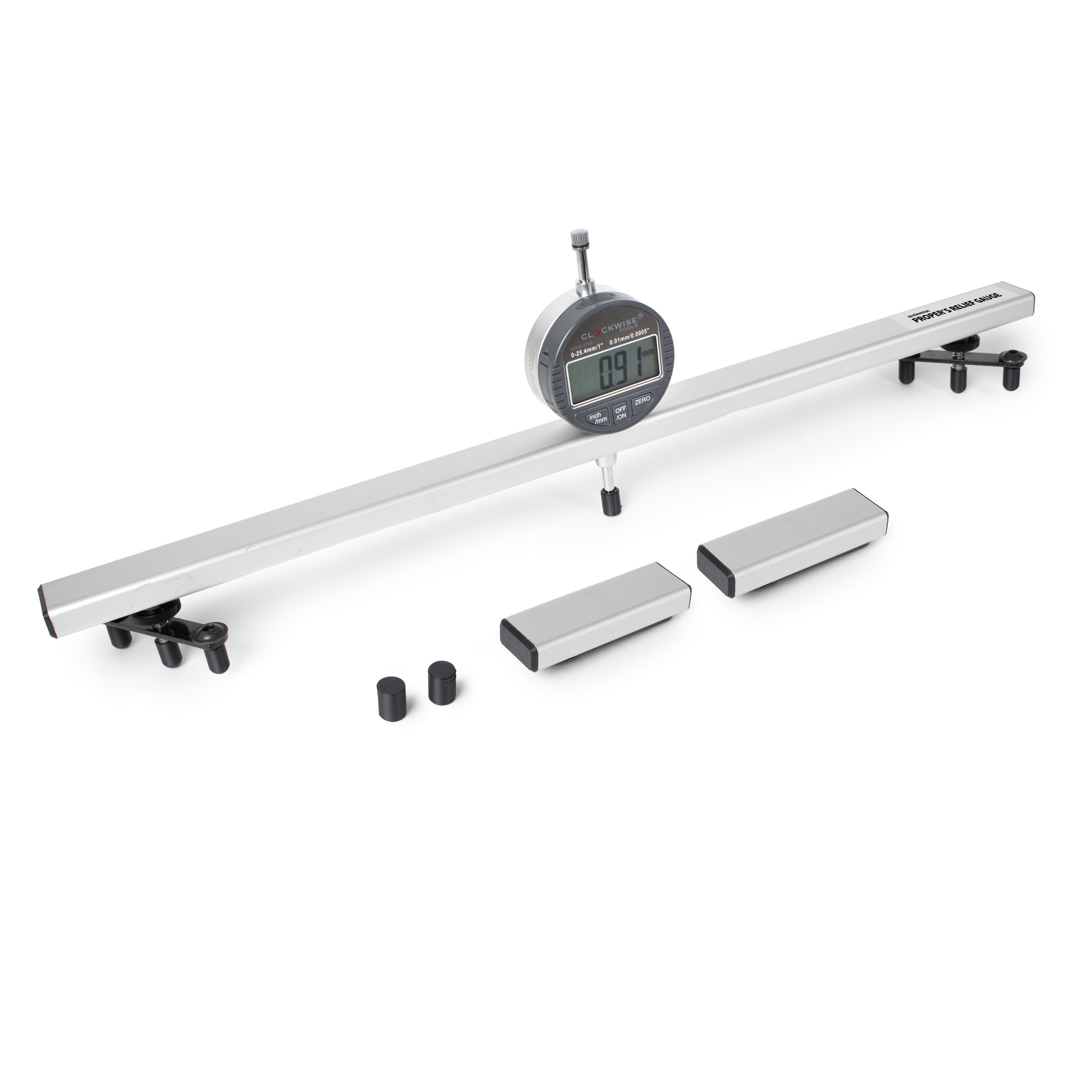 Stellen Sie die verstellbaren Füße auf Ihre Mensur ein und streichen Sie den Hals, um die Linderung über die gesamte Länge zu lesen. Sie werden schnell hohe und niedrige Bereiche, Verdrehungen und Fallaways erkennen – alles, was Sie für eine saubere, konsistente Spielfläche benötigen.