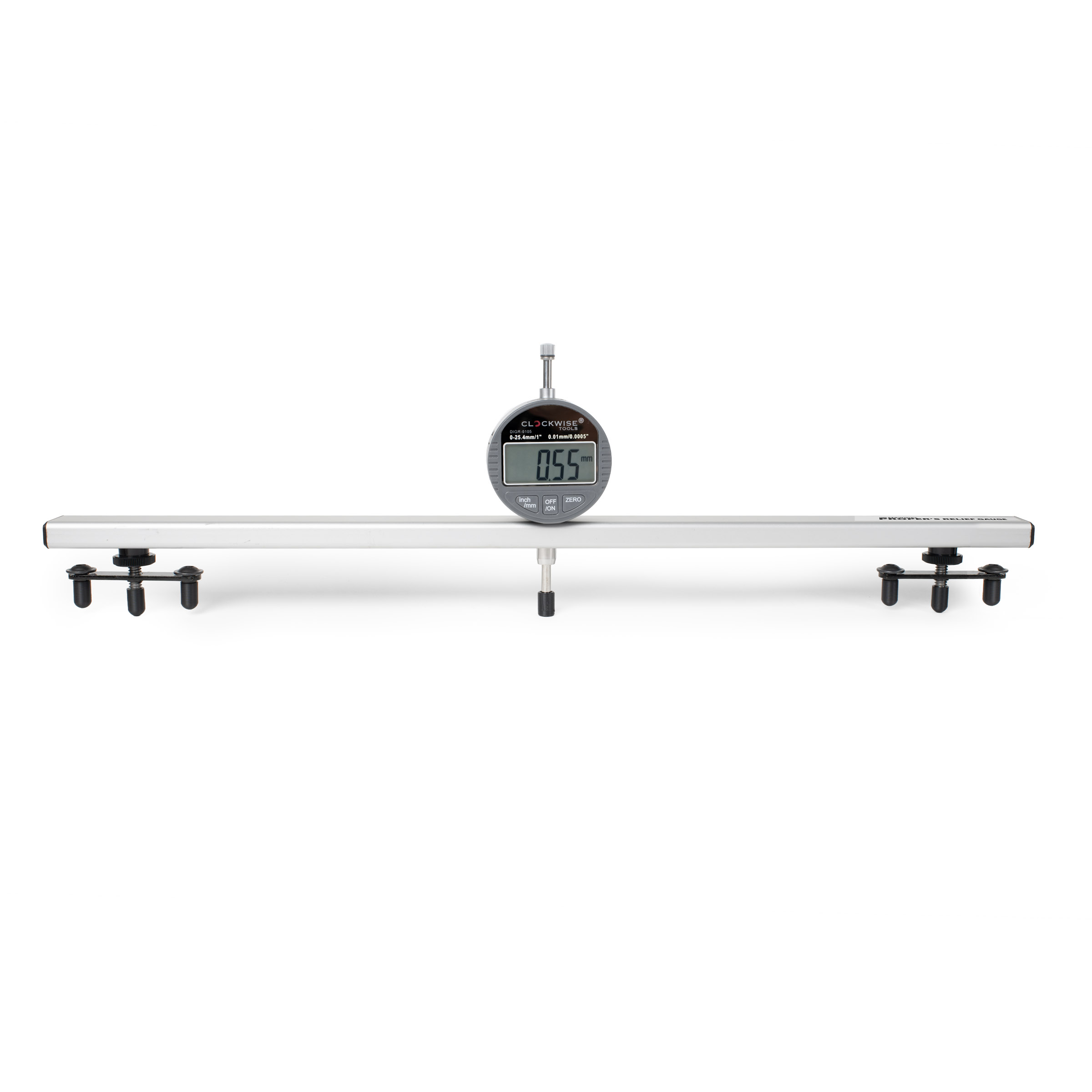 Stellen Sie die verstellbaren Füße auf Ihre Mensur ein und streichen Sie den Hals, um die Linderung über die gesamte Länge zu lesen. Sie werden schnell hohe und niedrige Bereiche, Verdrehungen und Fallaways erkennen – alles, was Sie für eine saubere, konsistente Spielfläche benötigen.
