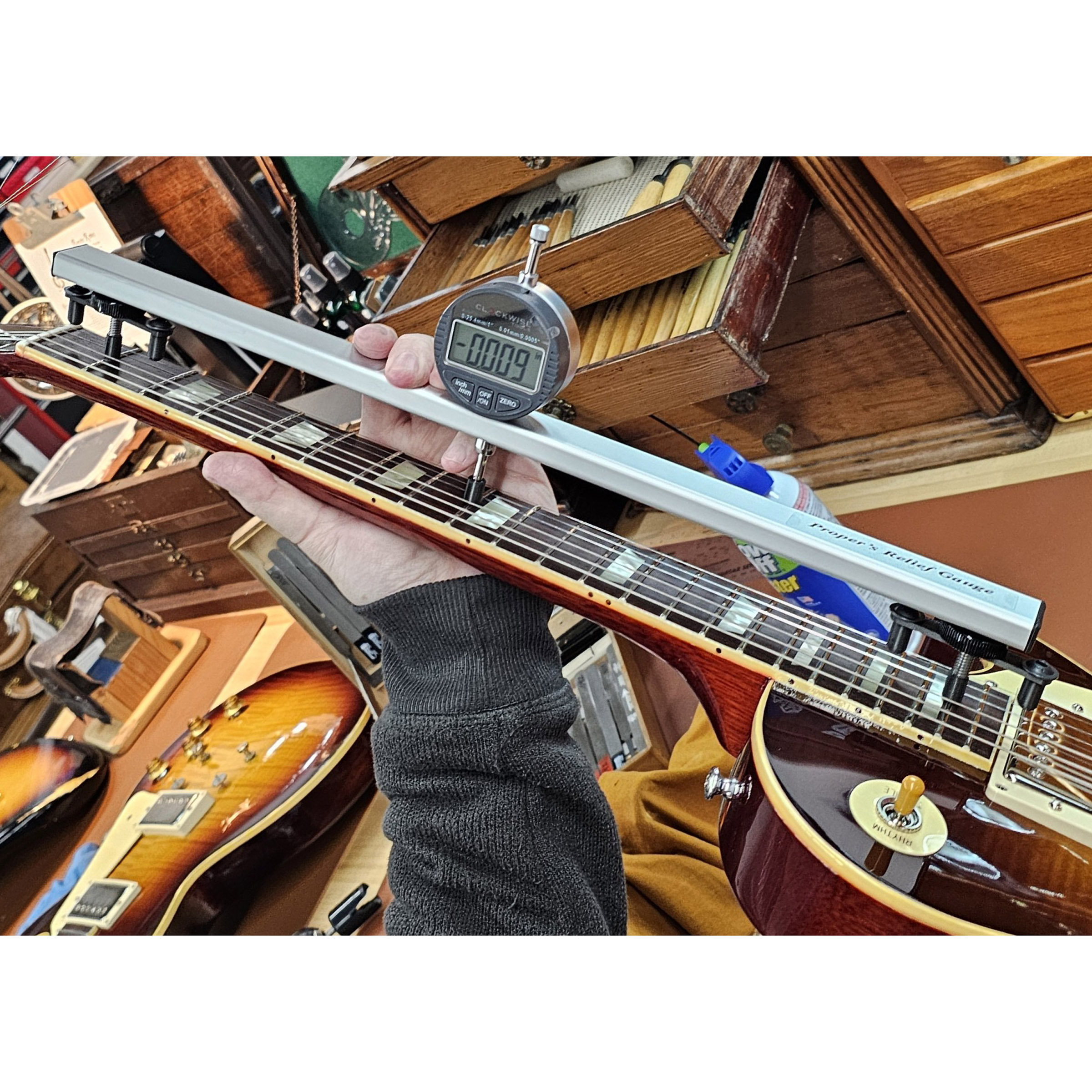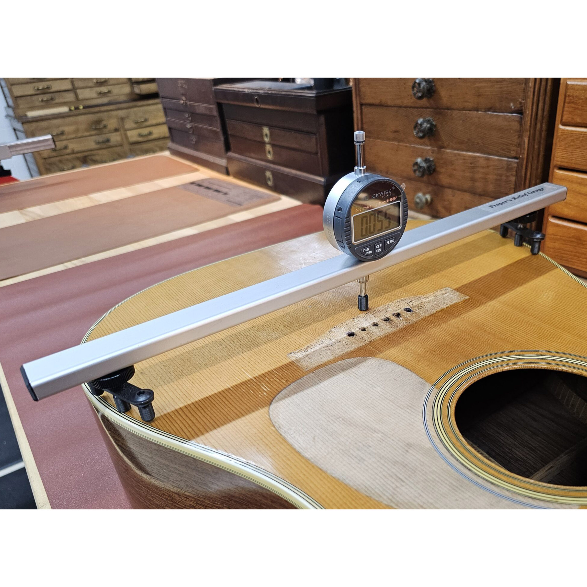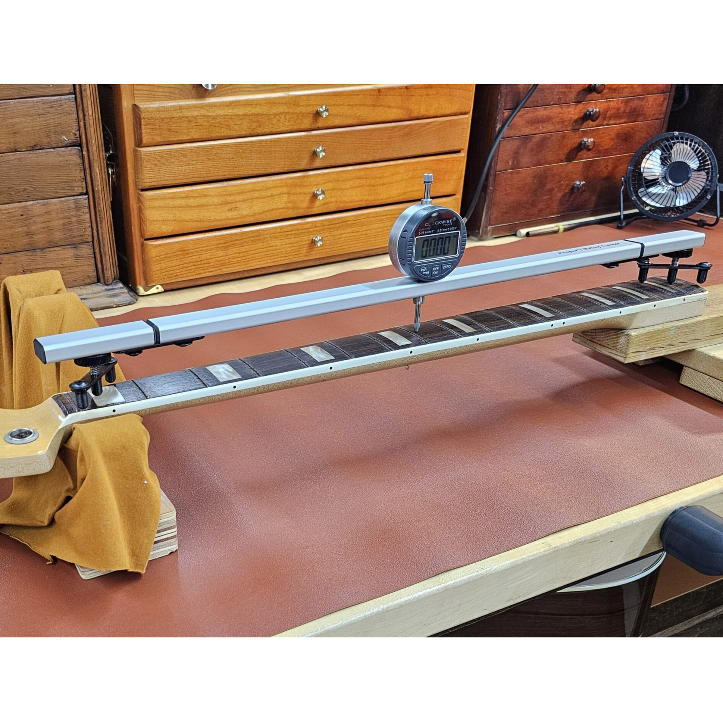 Egal, ob Sie sich für Relief entscheiden, ein Griffbrett vorbereiten oder Entscheidungen während eines Hals-Reset treffen – mit diesem Tool sind genaue, wiederholbare Messungen immer zur Hand.