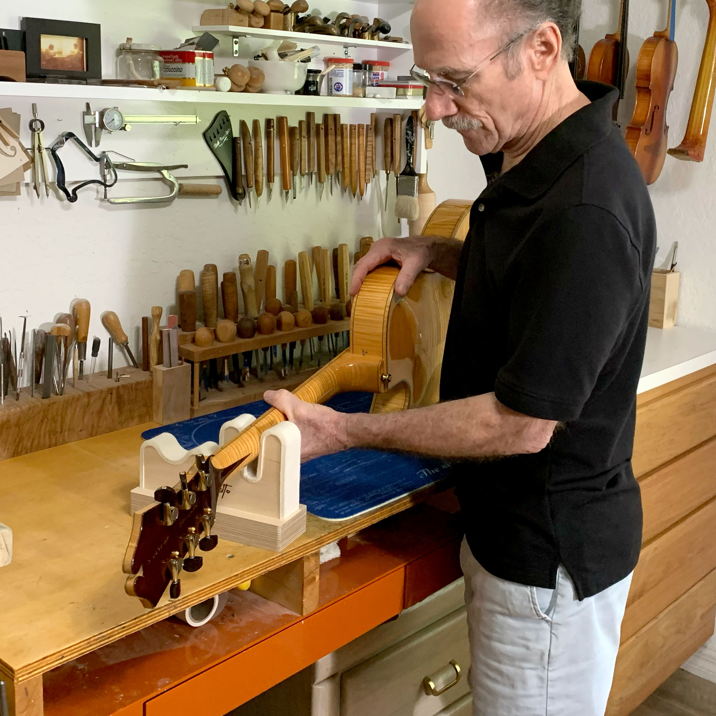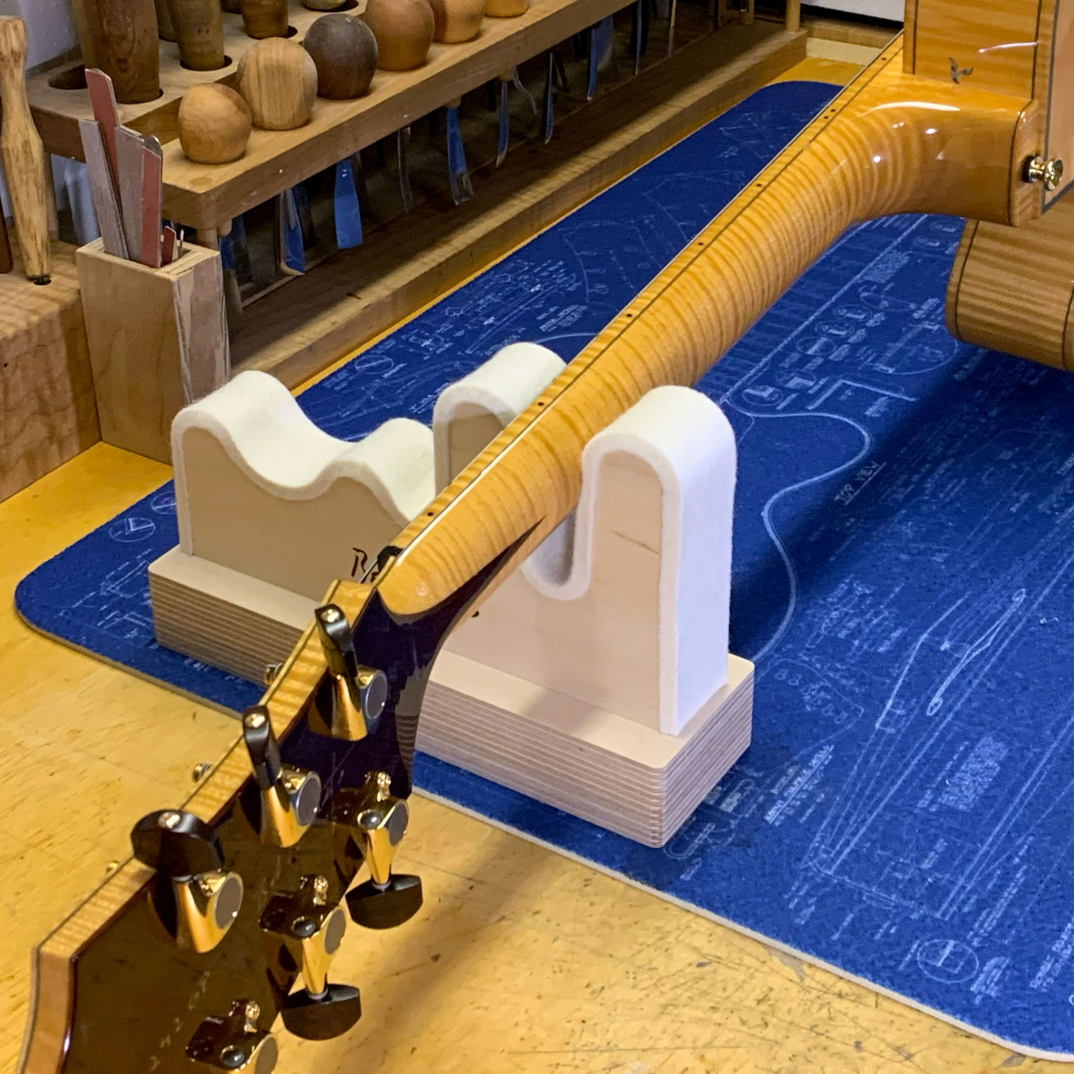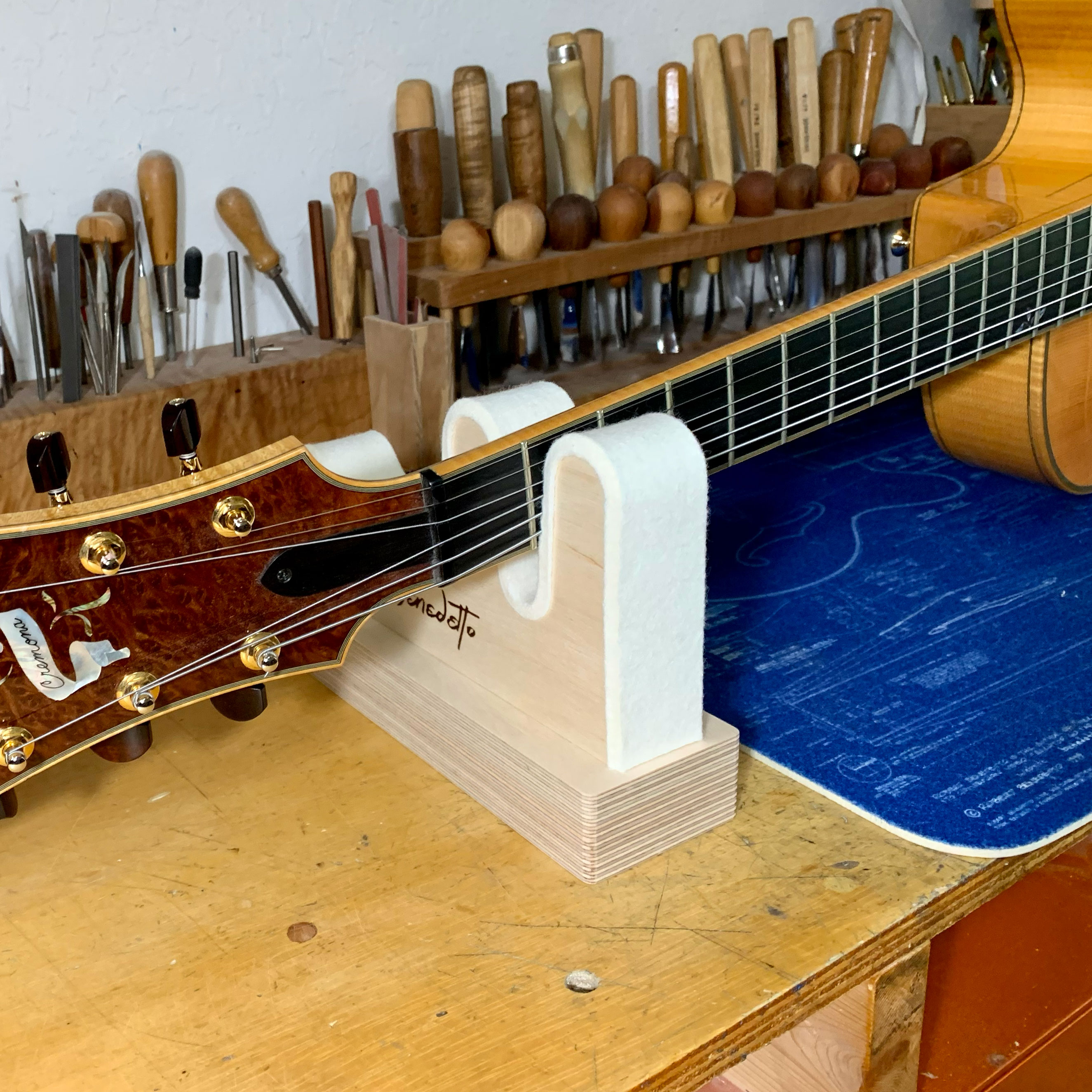 Die obere Nackenschlaufe hebt die Benedetto Nackenstütze von der Verpackung ab. Die spezielle Form hält die Gitarre perfekt an der Seite. Warum? Es ist ideal, um Anpassungen in der Spielposition vorzunehmen – kein unangenehmer Balanceakt mehr! Es wird schnell zu einem unserer bevorzugten Setup-Tools. Die zusätzliche Höhe ist auch genau das Richtige für das Arbeiten auf großen Archtops und Akustikgitarren.
