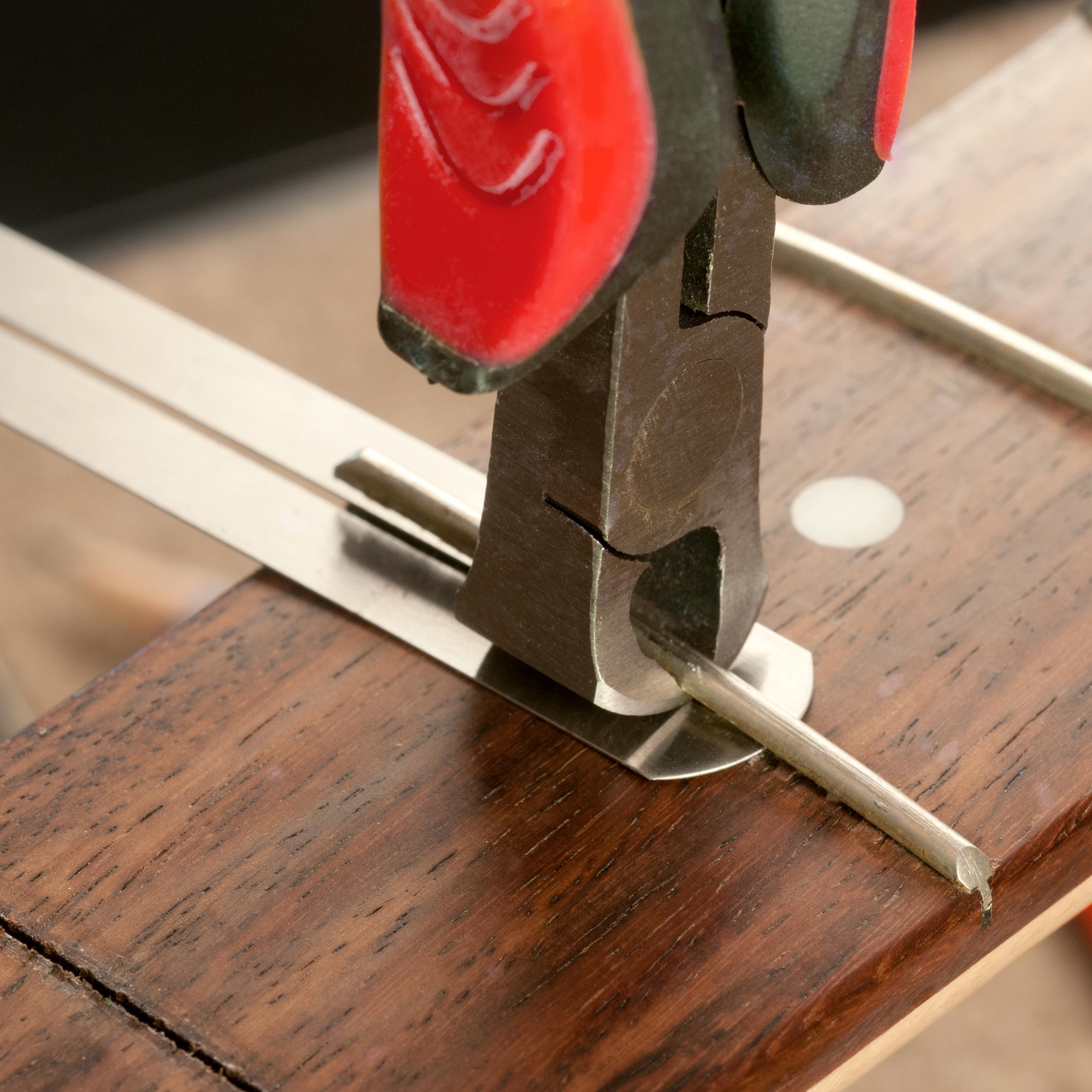 Chip Stoppers drücken auf die Fingerplatte, wenn die „Fret Puller“-Ziehzange nimmt Ärger auf. Sie erhalten weniger Späne und sauberere Refraktionen. Schade, dass wir vor zwanzig Jahren nicht daran gedacht haben – stellen Sie sich die Stunden vor, die wir alle eingespart hätten!