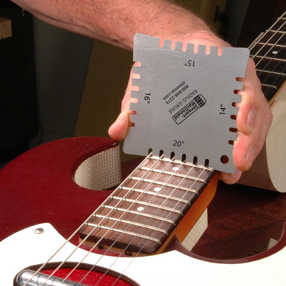 Gitarren haben üblicherweise einen „Zusammensetzungsradius“, was bedeutet, dass sich die Krümmung von der Mutter zum Ende der Fingerplatte ändert. Diese subtile Veränderung ist nahezu unmöglich. Deshalb ist eine Reihe von Radiusmessgeräten unerlässlich. Verwenden Sie sie auch zum Profilieren eines akustischen Brückensattels und zum Einstellen der Saitenhöhen auf einer elektrischen Gitarrenbrücke.