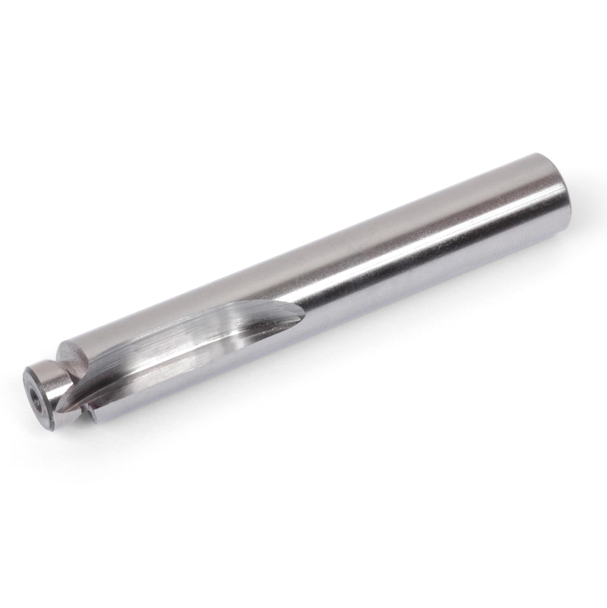 Hier ist ein Tipp von unserem lutheren Freund Bryan Galloup: Grover- und Gotoh-Tuner mit Gewindebuchsen sollten in gegengebohrten Zapfenlöchern installiert werden. Ein fester Durchmesser von 5/16" oben an der Bohrung verhindert, dass die Buchse unter dem Zugband neigt, wodurch die Lackoberfläche um die Buchsenscheiben geschützt wird. Auf Vorschlag von Bryan haben wir diesen speziellen langsamen Stahlfräser entwickelt, der die Unterseite des Zapfenlochs genau an das Getriebegehäuse anpasst.Der Fräser verfügt über einen Piloten mit einem Durchmesser von 0,310" (7,87 mm) und zwei Spannuten, die eine Senkbohrung mit einem Durchmesser von 0,397" (10,08 mm) in einem Zapfenloch mit einem Durchmesser von 5/16" (7,94 mm) schneiden. Wenn das vorgesteuerte Ende des Fräsers bündig mit der Stirnseite des Zapfenkopfes ist, wurde die richtige Senkbohrungstiefe aufgebohrt.