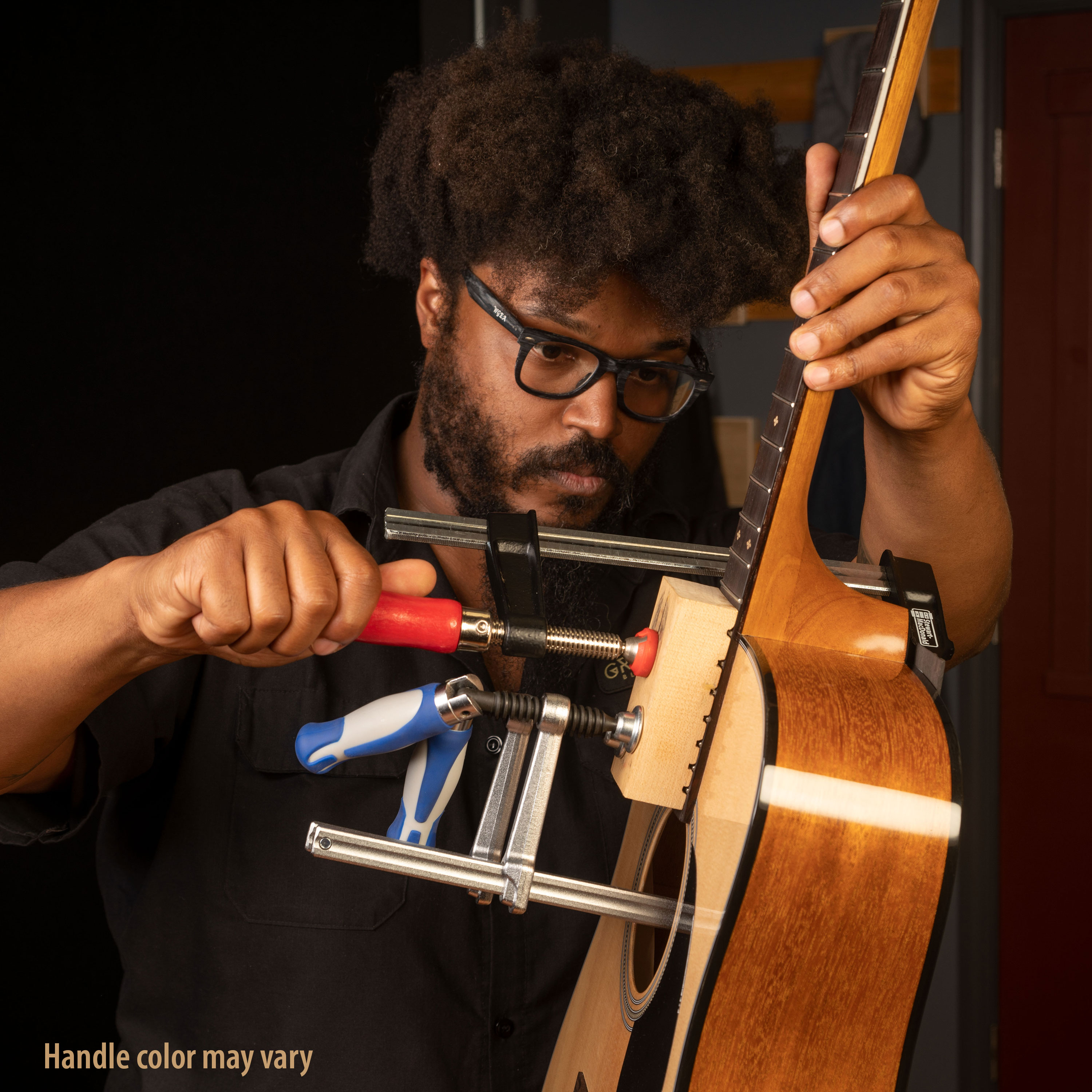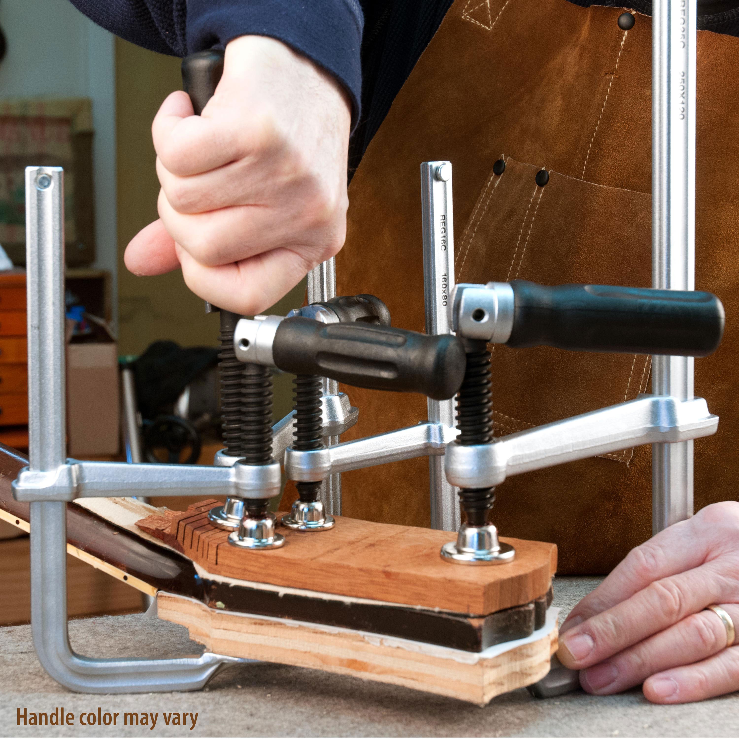 Der Komfortgriff dreht sich in die aufrechte Position, wenn es zu überfüllt wird. Robuste Stahlkonstruktion. Hervorragend geeignet für die Reparatur von Kopfplatte-Brüchen, das Laminieren von Hälsen, das Kleben von Fingerbrettern und eine Million Anwendungen in der Werkstatt.