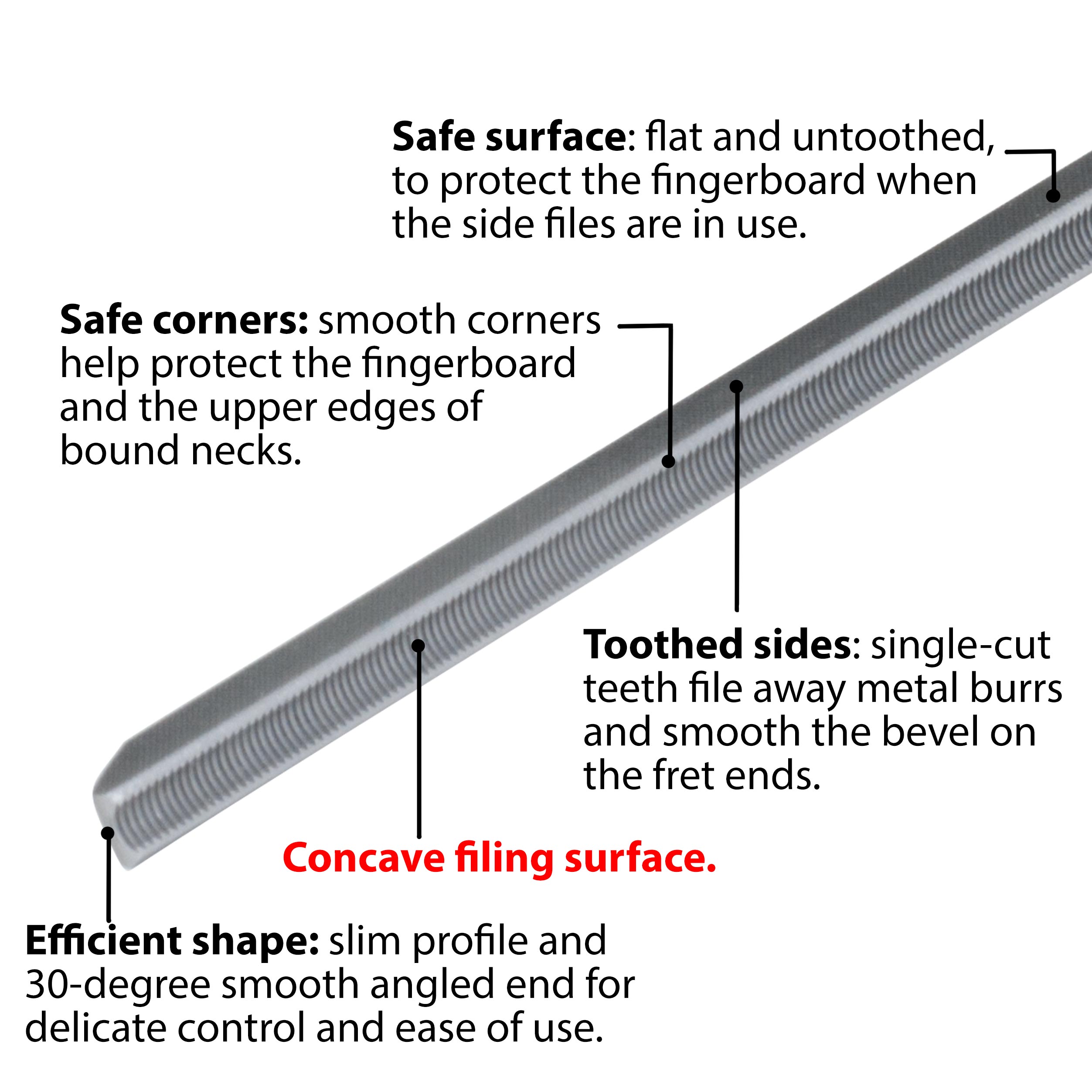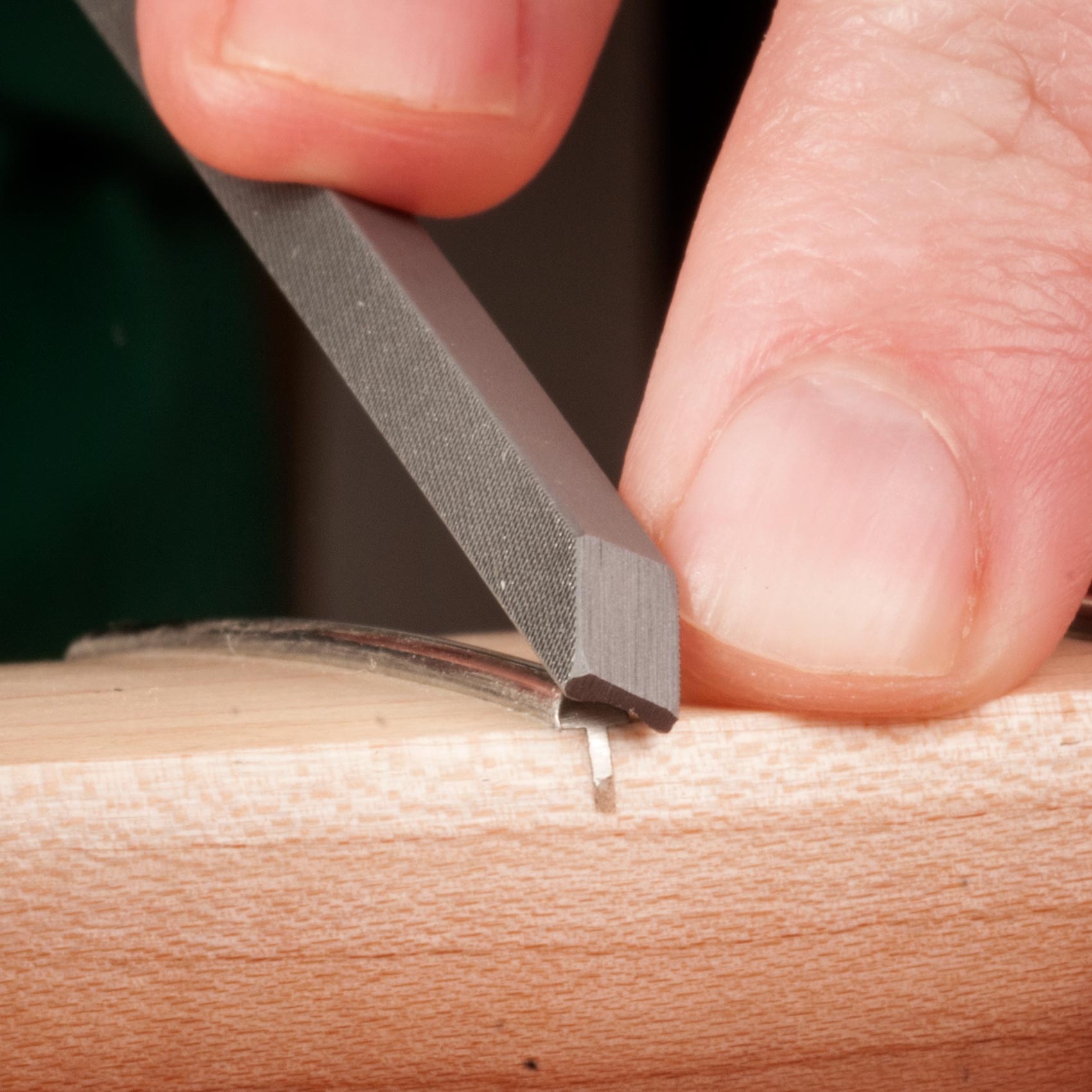Sichere Ecken: Jede Datei hat auch glatte, ungezahnte Ecken, um Schäden an der Fingerauflage und den oberen Kanten der eingefassten Hälse zu vermeiden.