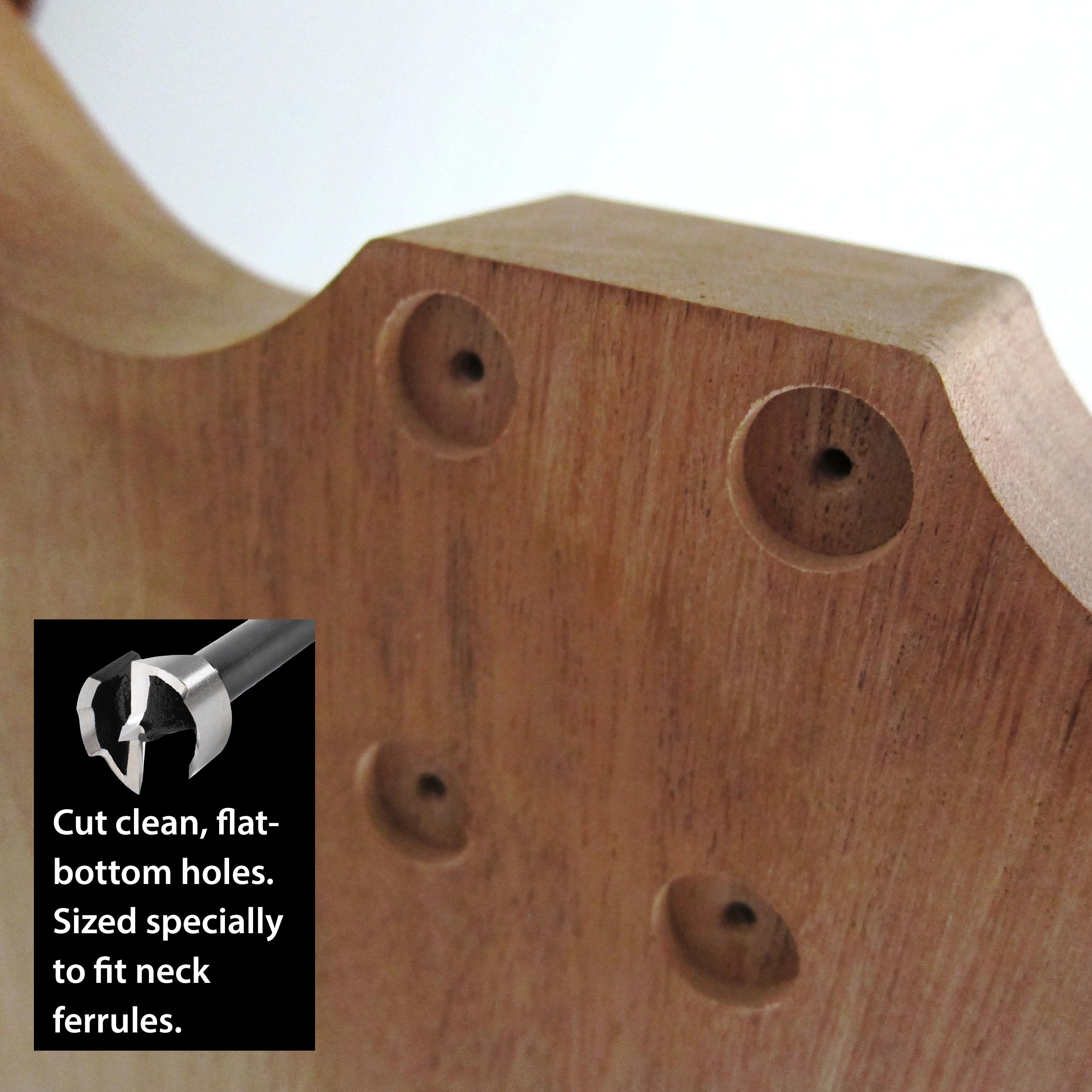 Bohren Sie Löcher mit flachem Boden und glatten, sauberen Kanten. Ideal für die bündige Montage der Halsbefestigungshülse (es gibt schließlich keine Halsplatte zum Verbergen von eingerissenen Löchern).