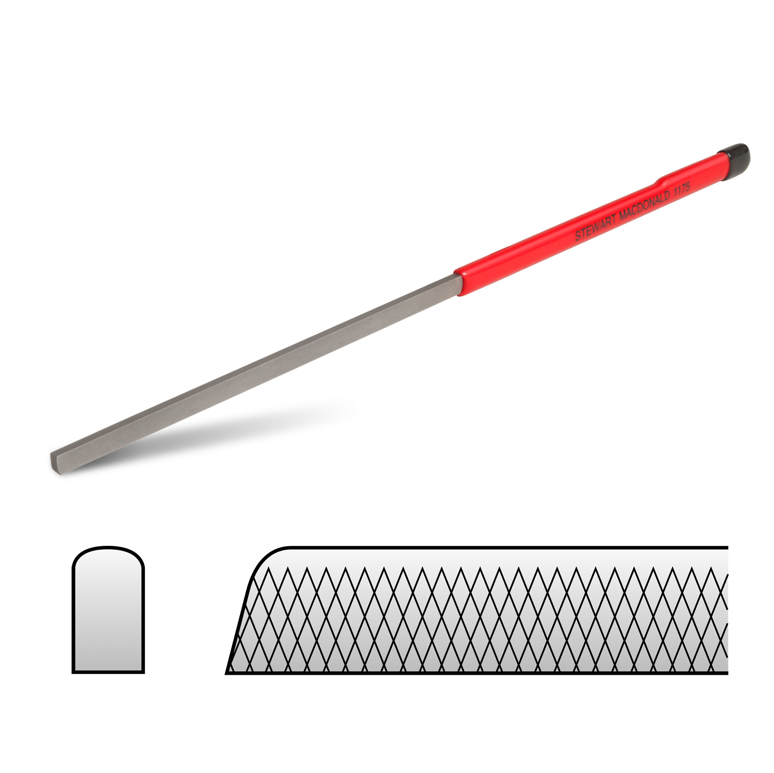 Zum Abrunden, Formen und Entgraten.Mit dieser spezielle Feile werden die Bundenden nach dem Einbau, Bündigschneiden und Abschrägen bearbeitet.