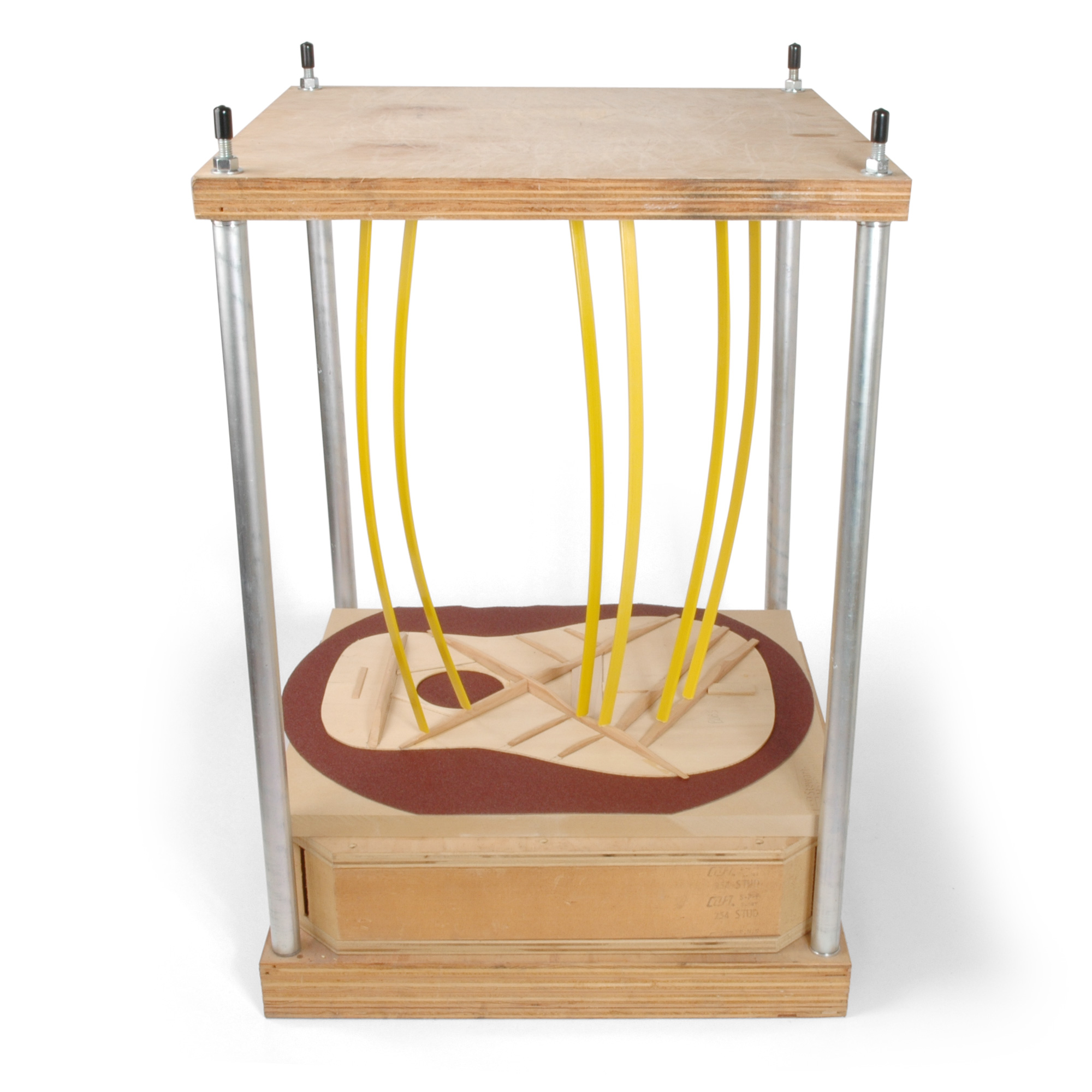 Verwenden Sie das Go-Bar-Spannsystem zum Schleifen und Kleben von Klammern für unser Akustikgitarren-Kit. Für den Gitarrenrücken wird das 20-Fuß-Deck empfohlen. Die 28-Fuß-Radiusschale kann für das Soundboard verwendet werden.