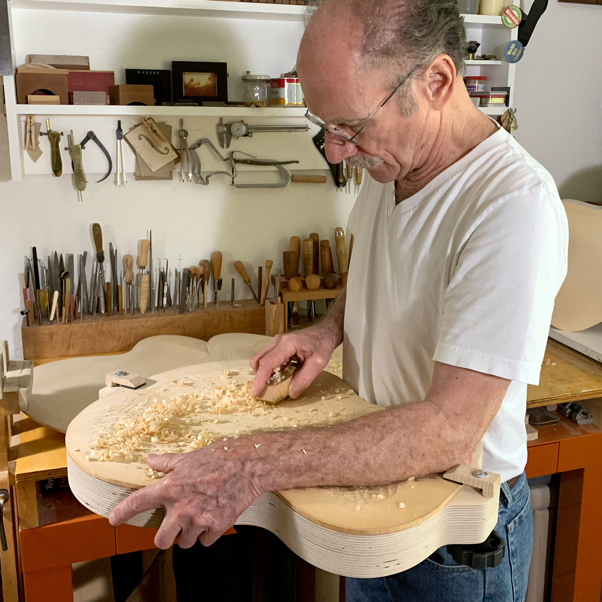Aber es geht nicht nur um das Schnitzen! Die Wiege sichert auch die Oberseite für die Anpassung von Klammern, ein wichtiger Schritt bei der Feinabstimmung des Klangs der Gitarre.
