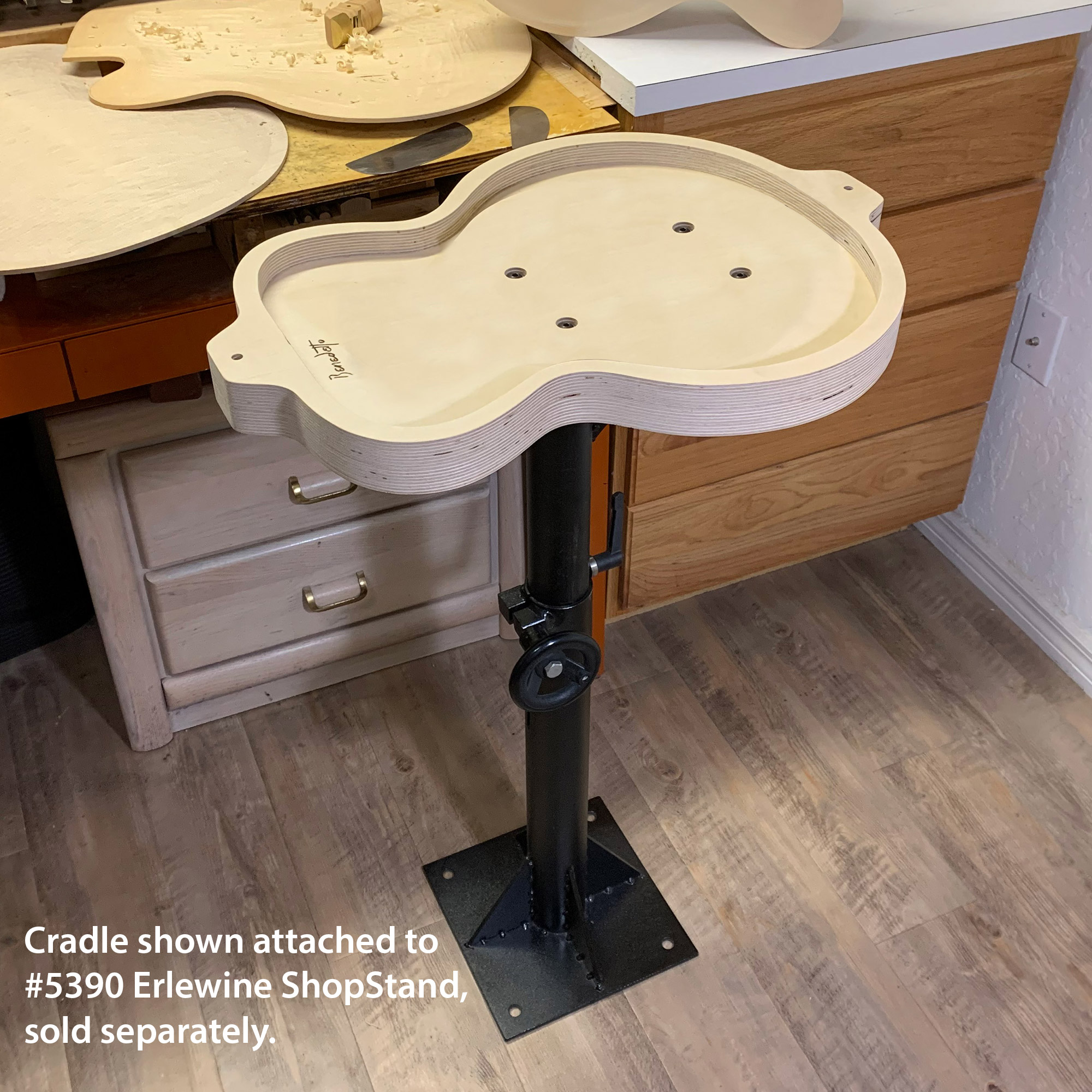 Die Schale ist vorgebohrt, um sicher an unserem Erlewine ShopStand befestigt zu werden, damit Sie die volle Kontrolle haben. Sie können die Wiege um 360 Grad drehen und sie auf die exakte Höhe anheben und absenken, die Sie für den perfekten Bogen benötigen. Die mühsame Aufgabe des Schnitzens war noch nie so einfach.