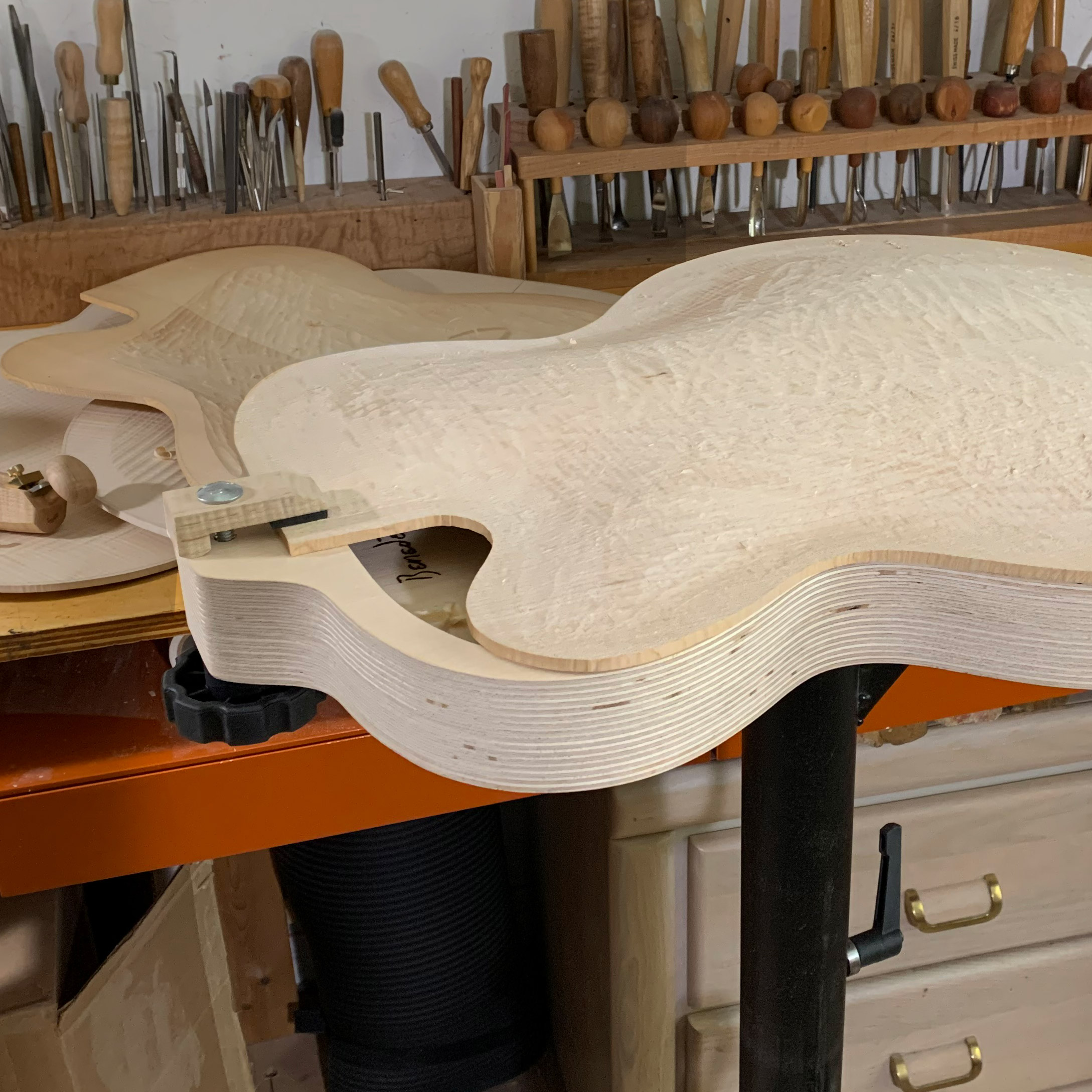 . Wir enthalten zwei Klemmenverlängerungsblöcke, um einen montierten Körper zu sichern. Dadurch ist die Gitarre perfekt positioniert, um die Rekurve oben und hinten zu kratzen. Dies ist entscheidend für die Gestaltung der Gitarre. Die Klemmfläche ist klein, um beim Schnitzen nicht im Weg zu bleiben.