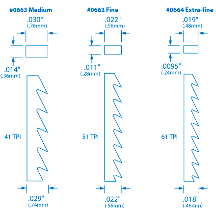 Klingen: 5-3/8" lang und in Packungen zu je 12 Stück erhältlich. Feine Klingen sind für komplizierte Arbeiten geeignet, mittlere Klingen schneiden etwas schneller. Extrafeine Klingen machen sauberere Schnitte in AbaLam.