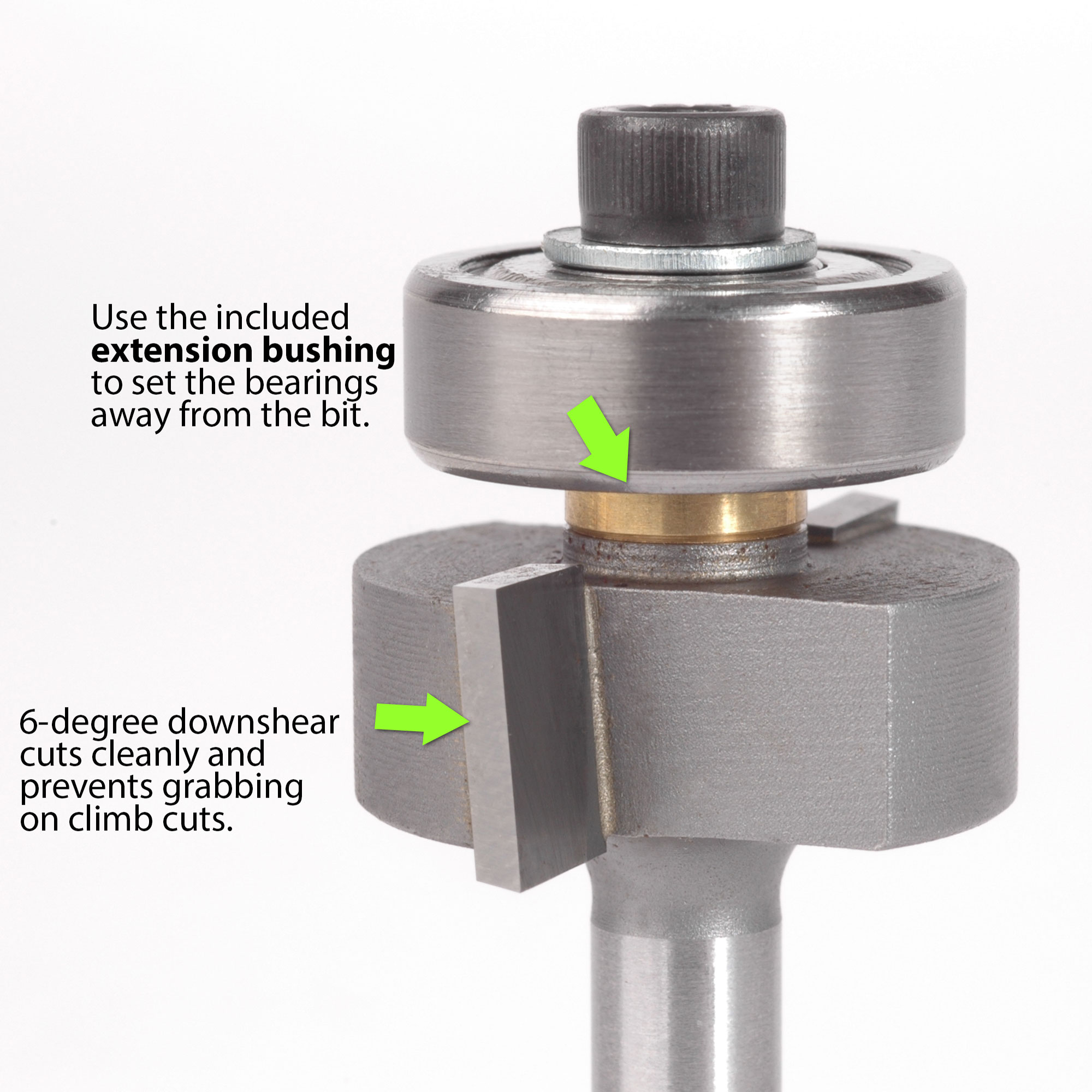 Unser Binding-Router-Bit verfügt über einen 1/4"-Arbor, der zu Ihrem Shop-Router passt. Die 6-Grad-Scherscheibe verhindert das Greifen an Aufstiegsschnitten für sauberere Ergebnisse. Das Bit verfügt über eine Inbusschraube mit Schraubenschlüssel für die Installation unserer Bindungsrouterlager – wählen Sie aus einer großen Auswahl an Schnitttiefengrößen für praktisch jede Binding. Eine spezielle Verlängerungsbuchse wird auch für die Führung von „treppenabgestuften“ mehreren Binding-Vorsprüngen geliefert.