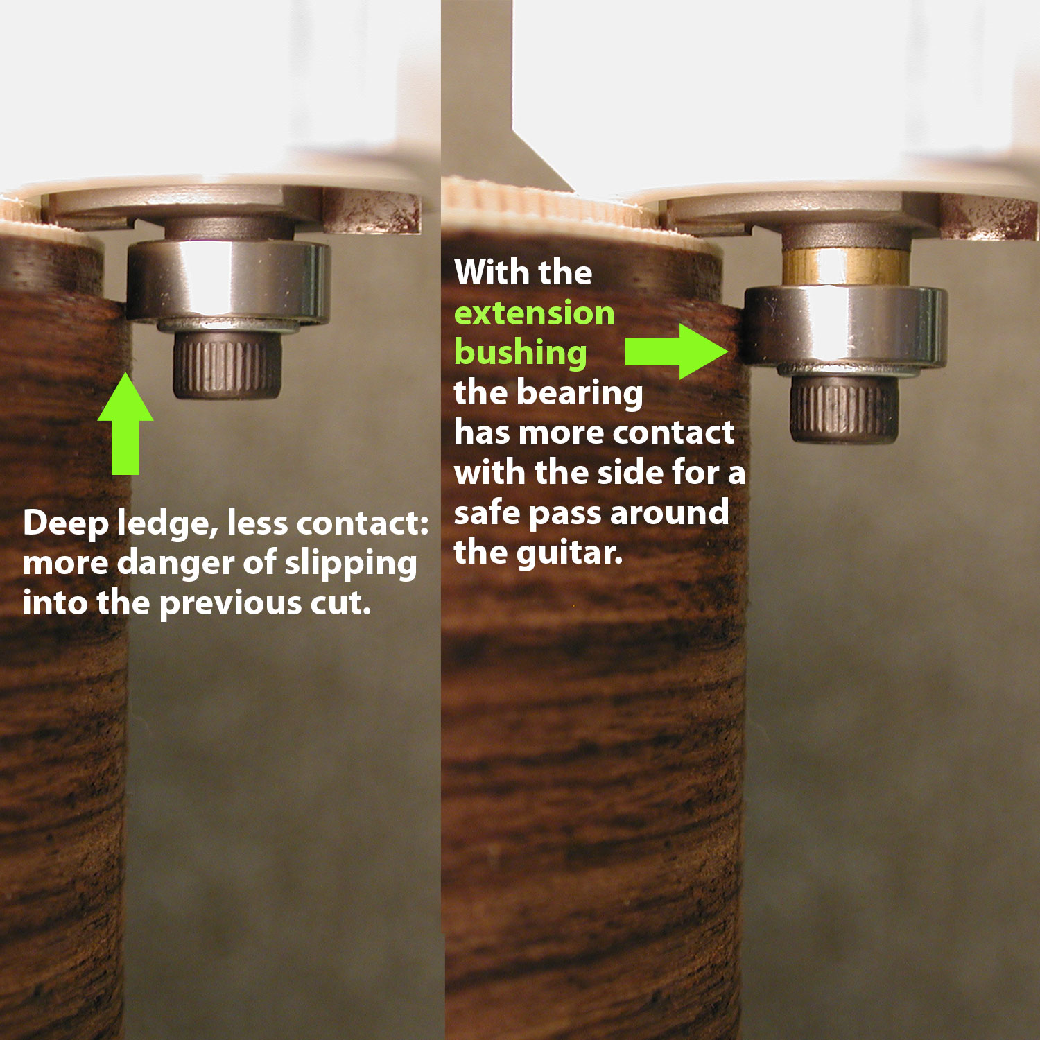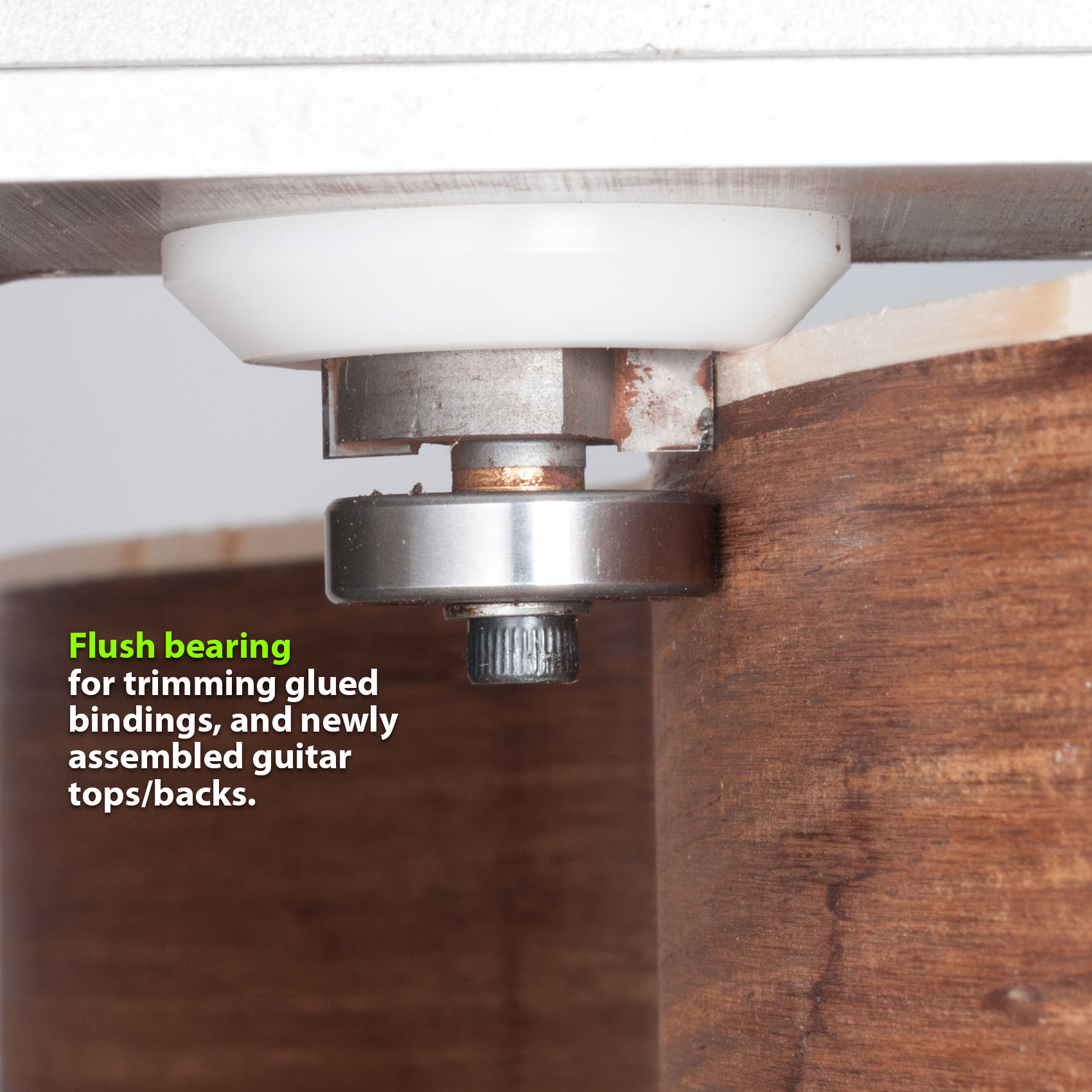 Geld sparende Sets ergänzen die Schnitttiefenlager, die speziell für Binding von Routing-Jobs und für bündige Gitarrenober- und -rückseiten ausgelegt sind. Anweisungen enthalten. Router-Bit und Lager sind auch separat erhältlich.