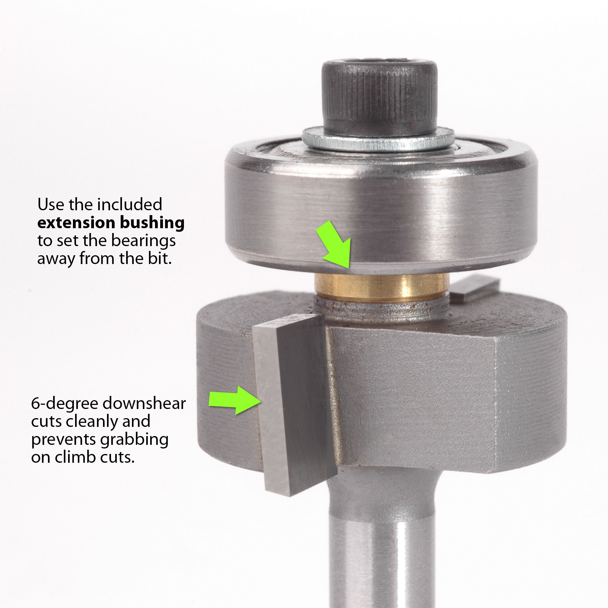 Unser sauber geschnittener Hartmetallschneider verfügt über einen 1/4"-Schaft für Ihren Router, eine Inbusschraube mit Schraubenschlüssel für die Montage eines Tiefschnittlagers und eine spezielle Verlängerungsbuchse für „Treppenstufen"-Vorsprünge.