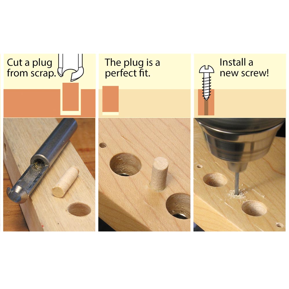 Verwenden Sie dieses kundenspezifische Werkzeug in Ihrer Bohrmaschine, um einen Holzstopfen mit 3/16" Durchmesser herzustellen, der perfekt zum Füllen des Lochs passt, das vom Extraktor oder dem Spiralbohrer hergestellt wurde.