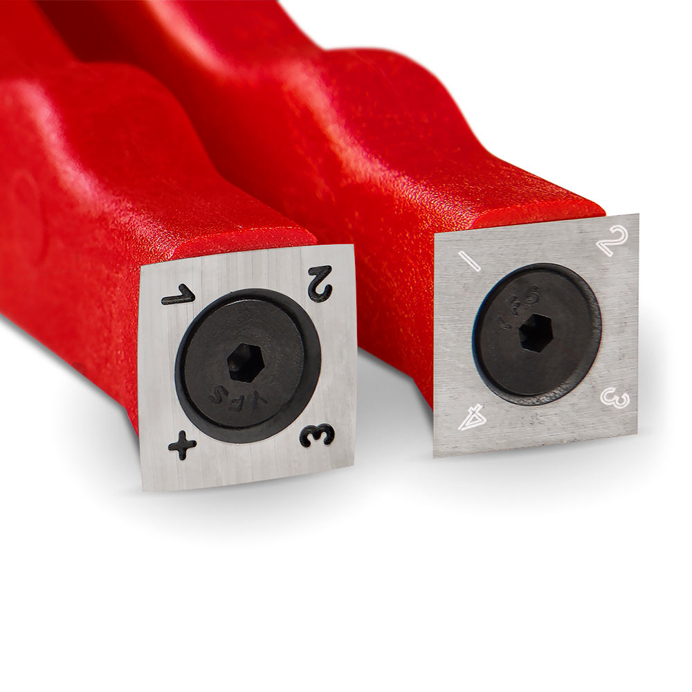 Die Standardklinge verfügt über gewölbte Kanten, um zu verhindern, dass die Arbeit zerrt wird. Eine optionale quadratische Klinge kommt in eckige Ecken.