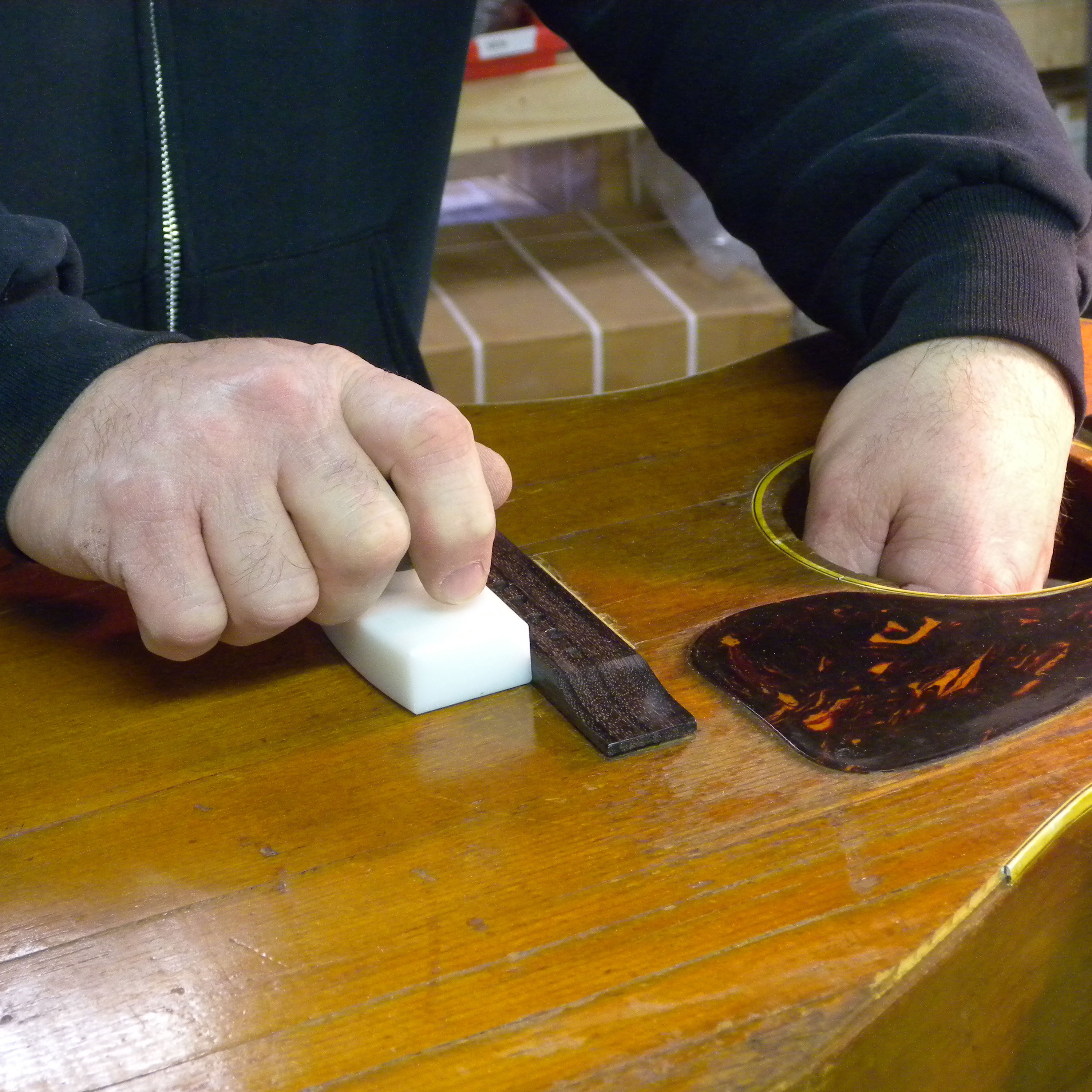 Das Entfernen einer akustischen Gitarrenbrückenplatte ist schwierig. Nach dem Aufweichen des Klebstoffs mit Hitze braucht es sorgfältig kontrollierte Kraft, um die Platte vom empfindlichen Gitarrenaufsatz zu trennen. Gleichzeitig müssen Sie die Oberseite vor Rissen unter Druck schützen. Unser Brückenblechmeißel und Top Support Dolly arbeiten zusammen, um dies zu erreichen.