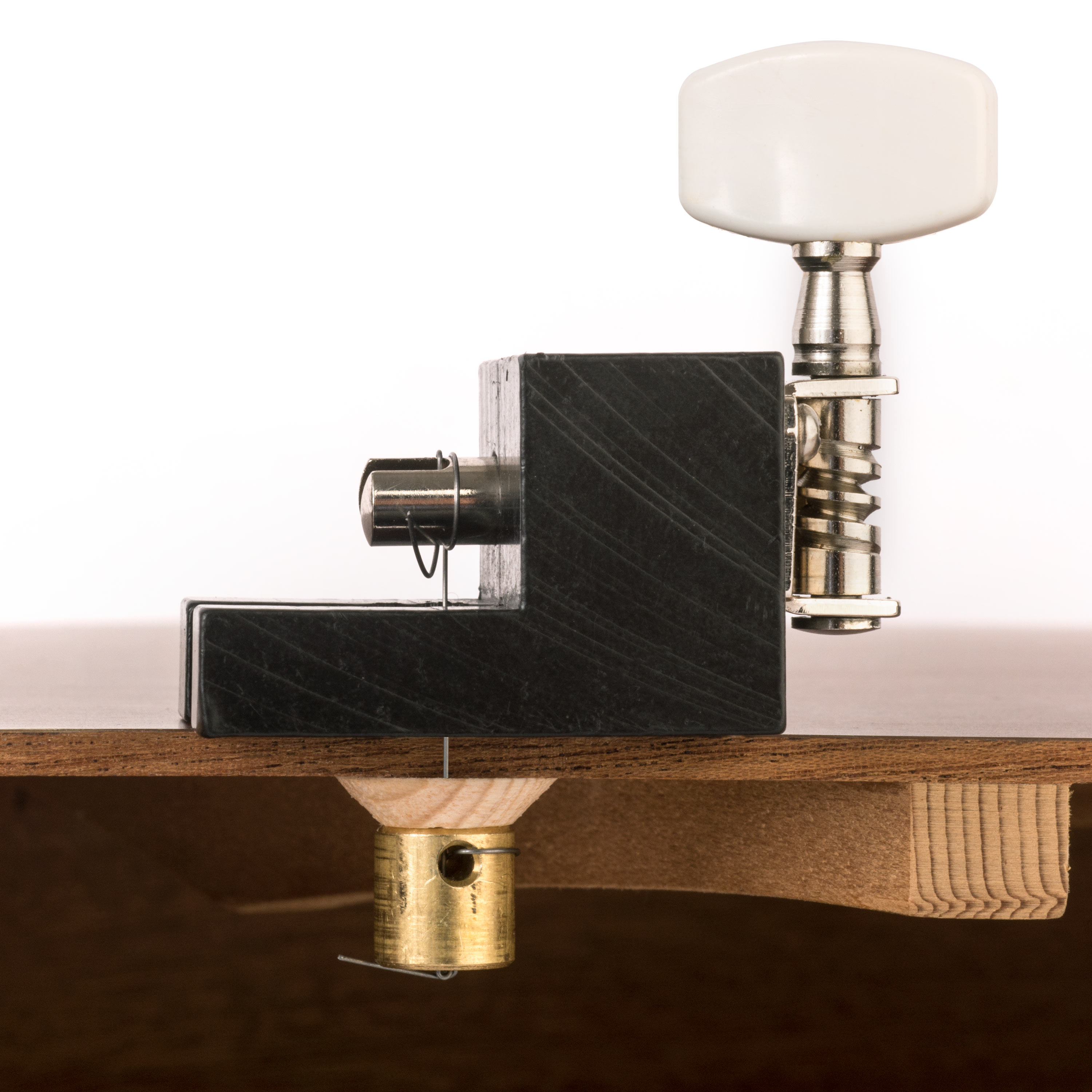 Riss schließen Unsere Rissklemme verwendet einen Gitarren-Tuner auf einer glatten Polyethylenbasis. Mit einem starken dünnen Draht zwickt er den Riss zu. Das Polyethylen zerkratzt die Gitarren nicht und der Klebstoff haftet nicht daran.