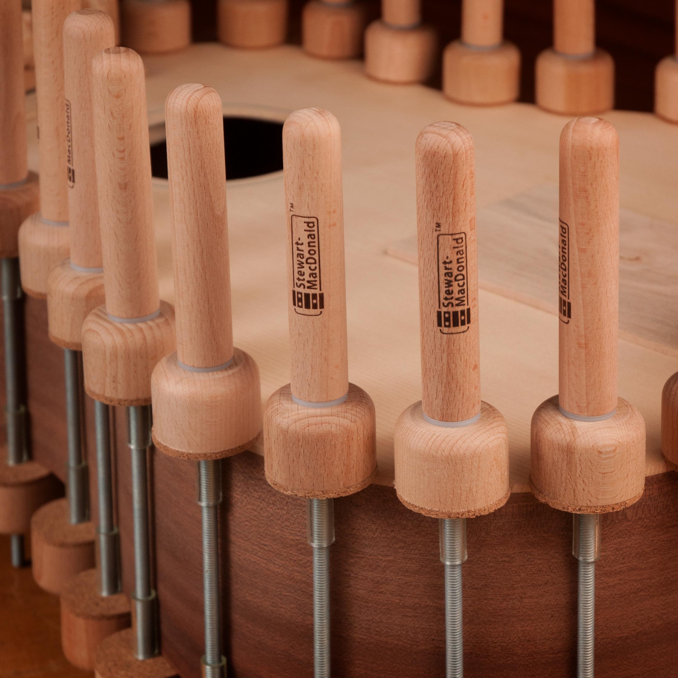 Die einfache Spulenklemme – zwei kurze Holzspulen auf einem langen Gewindebolzen mit Flügelmuttern-Anzug – ist seit langem ein vertrautes Werkzeug für die Montage und Reparatur von Soundboard/Rückseite. Wir haben uns gefragt, ob es schneller und weniger hübsch gemacht werden kann? (Schliesslich wird Klebstoff nicht ewig warten.) Die Antwort stammte von Klemmen, die von Don MacRostie von StewMac für den Einsatz in seinem eigenen Geschäft verfeinert wurden: Ersetzen Sie die Flügelmutter durch einen fingerfreundlichen Hartholzgriff. Durch kurzes Drehen der unteren Spule wird die Klemme geschlossen, und durch einfaches Drehen des Griffs wird der Druck ausgeübt.