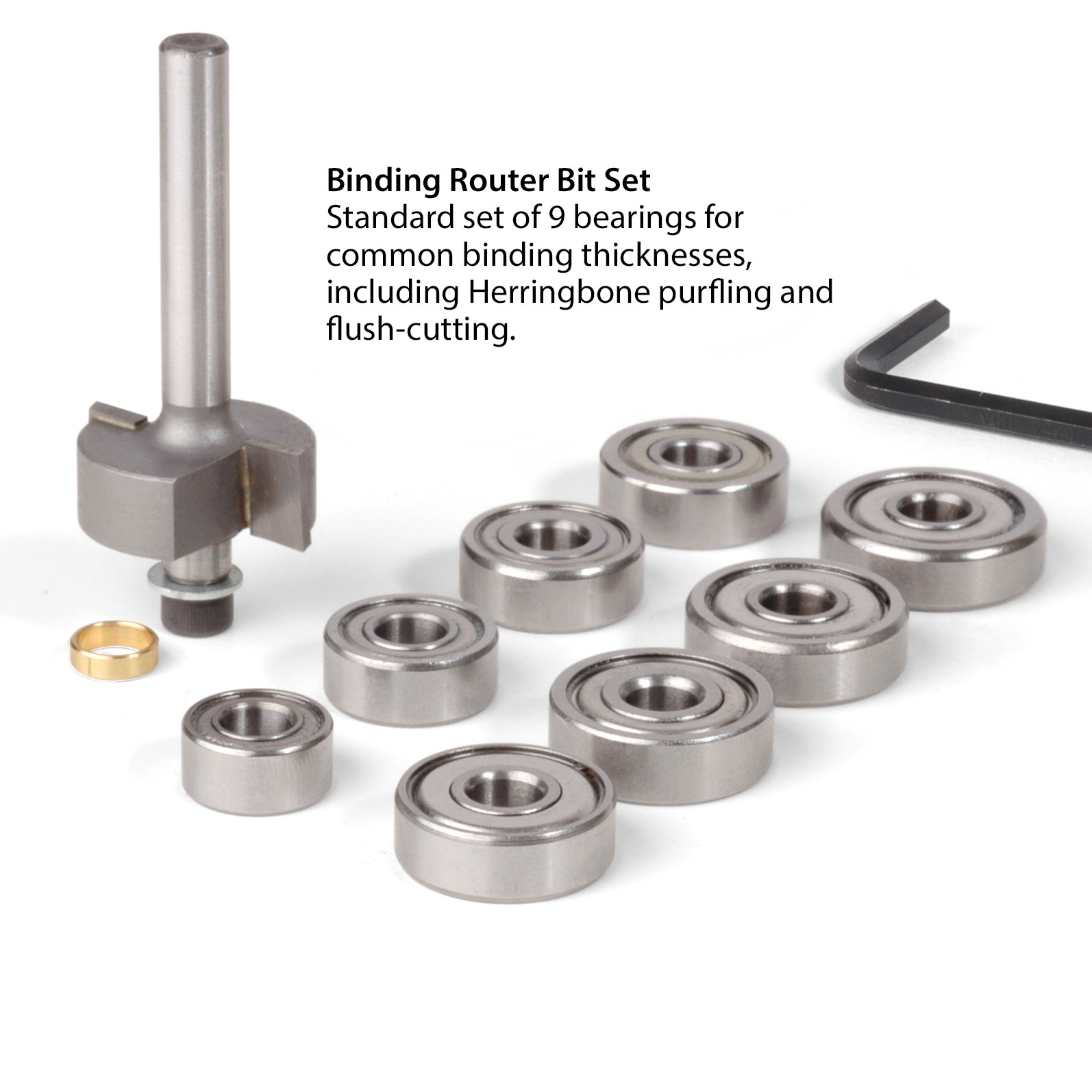 SPEICHERN Sie, wenn Sie dieses TrueChannel-Set kaufen, das unser #1298 Binding Router-Bit-Set enthält. Das speziell für Schmiervorrichtungen entwickelte Set verfügt über einen superscharfen Hartmetalleinsatz mit 1/4"-Schaft und kundenspezifische Lager zum Schneiden der gängigsten Breiten für Binding.
