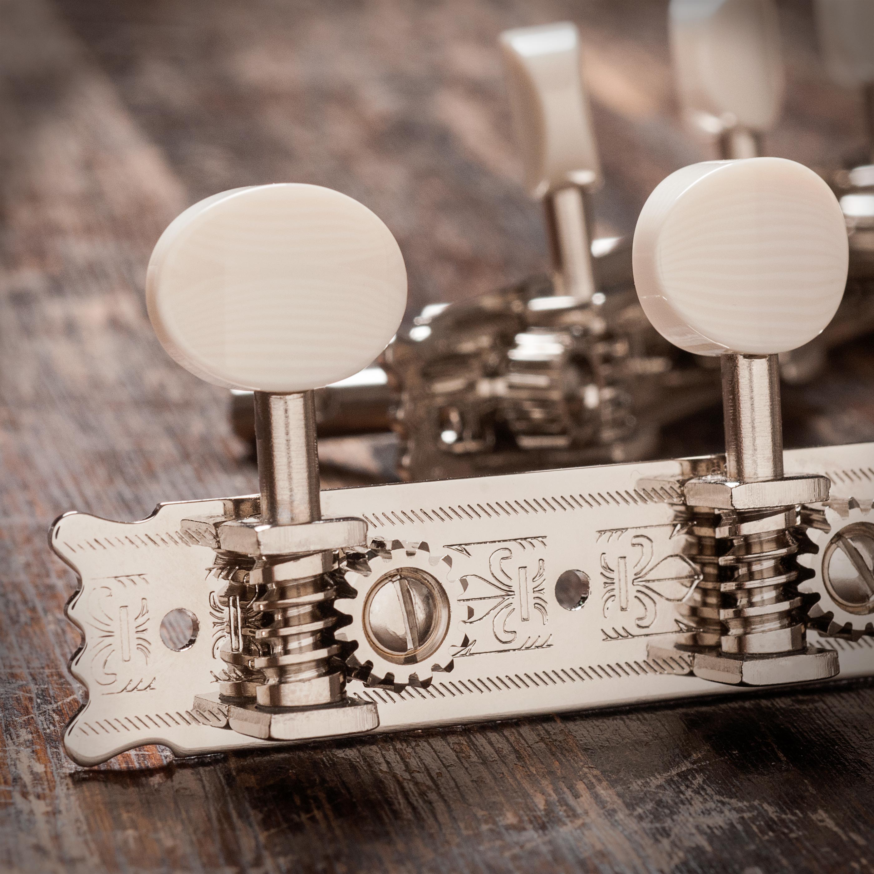 Tuner aus dem Golden Age sind die Wiedergeburt beliebter Maschinendesigns mit offenem Gang im frühen 20. Jahrhundert. Ersetzungen für die Originale werden seit langem von Sammlern und Luthiers gesucht, um ältere Gitarren wiederherzustellen und ihre Abstimmung zu verbessern. Sie sind ideal, um Reproduktionsinstrumenten einen authentischen Vintage-Touch zu verleihen.
